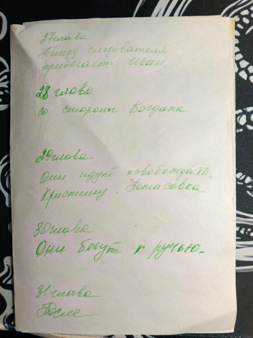 Мне вообще, тяжело составить какой-то глобальный план на историю. Я больше заморачиваюсь персонажами, пока у меня нет чёткой картинки героя — история не родится. А потом получается так: я словно наблюдаю за ними и описываю то, что вижу.