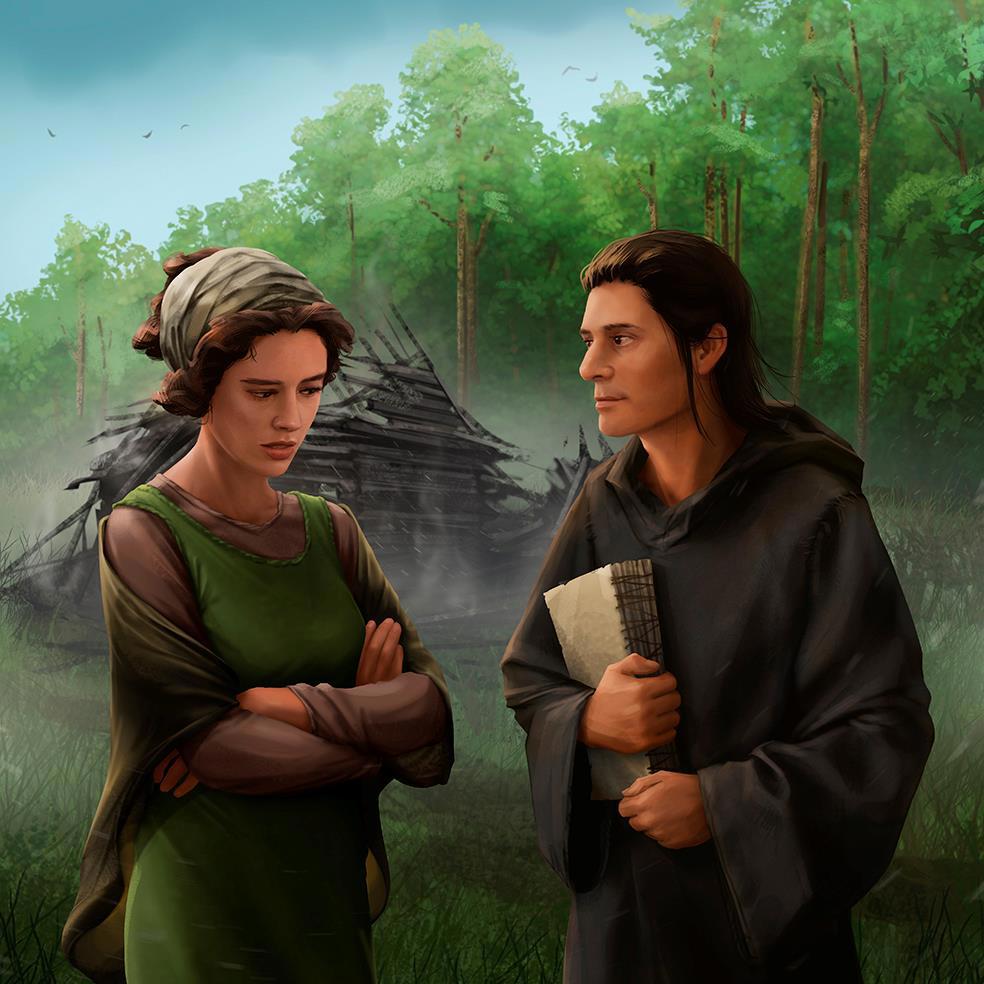 Отрывка, по которому Василь создавал иллюстрацию, еще не существует на бумаге. Но это не помешало ему создать то самое ощущение уныния, которое сопровождает данный финал: последними носителями идей этого дома стали не главные персонажи, а редко попадавшийся в повествовании Джон (он же - друг Жана Бодена Люка) и вообще посторонняя во всей катарской истории Софи - крайне невезучая жена Жана Бодена. Джону будет суждено вернуться к уже сгоревшему Дому и от безысходности решить попытать счастье где-нибудь максимально далеко оттуда, почему бы и не в Лондоне (до которого, по современным расчетам, идти пешком от южного перебежья Лондона - по бездорожью, спасаясь от разбойников, прячаясь от властей и ночуя, где придется - года 2-3). На пепелище Джон найдет только незнакомую женщину, и возьмет ее с собой в неизвестность. Он никогда не узнает, что Софи родом из 20 века, она никогда не найдет пути вернуться в Будущее, а вдвоем им не суждено узнать, чем завершаться истории остальных жильцов лесного Дома.