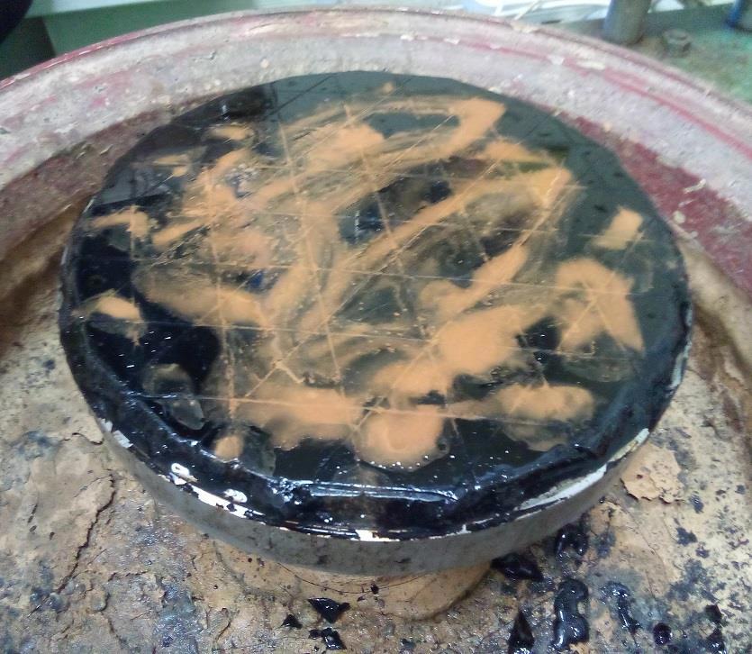 Я был готов продолжать, но тут моим собратьям-стеклотерам понадобился станочек, чтобы отлить еще один полировальник (вчера вообще у нас было людно). Ладно, уступил. И уж если плавится смола и по коридорам МПГУ распространяется амбре, то я могу сделать еще одну вещь -- заготовку будущего звездчатого полировальника для параболизации. Нашел подходящую (меньшего диаметра, так надо) план-шайбу, сделал бортики из ватмана и вылил смолу: