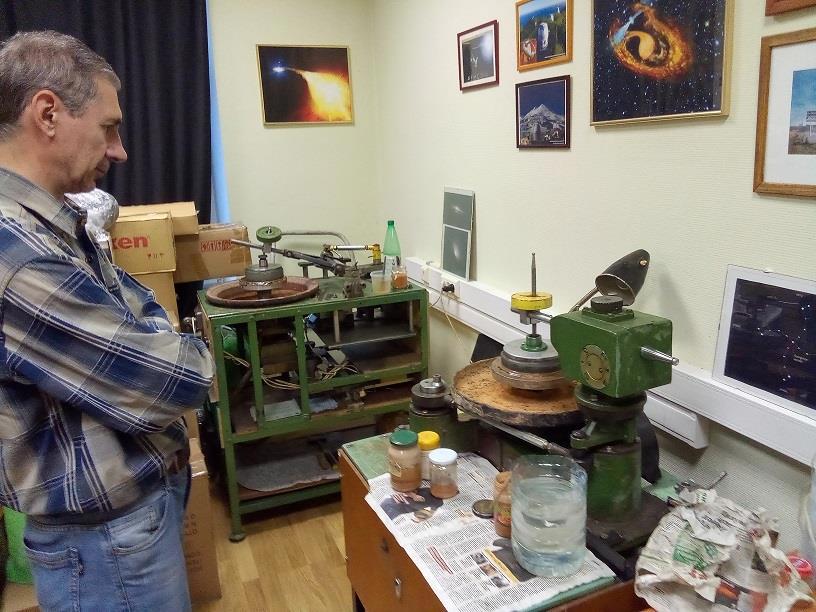 Работаю не один я, в деле еще один станок (профессиональный, хоть и сильно устаревший). Он хорош, но в нем только один двигатель с ременным вариатором, а не два, как в нашем самодельном станочке. Так что для работы с небольшими зеркалами я предпочитаю самодельный станок.