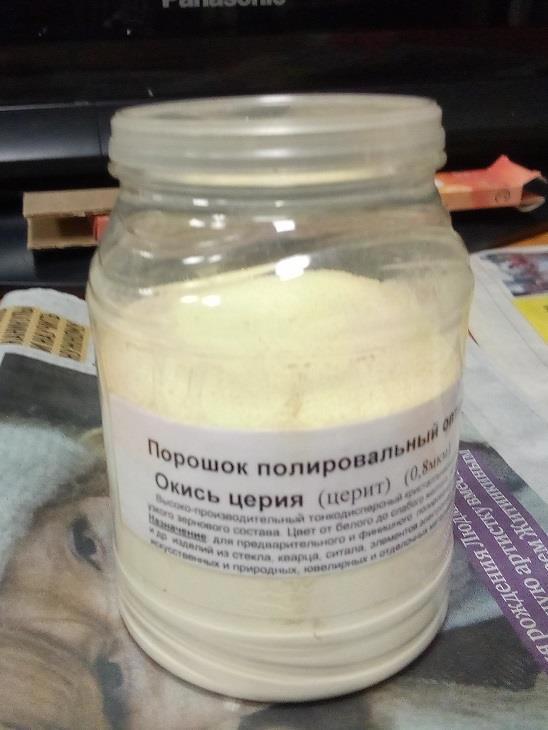 Встречается и чистая (ну почти) окись церия, она белая или чуть-чуть розоватая и полирует еще быстрее. Это дефицитный и дорогой порошок, но у нас есть немного: