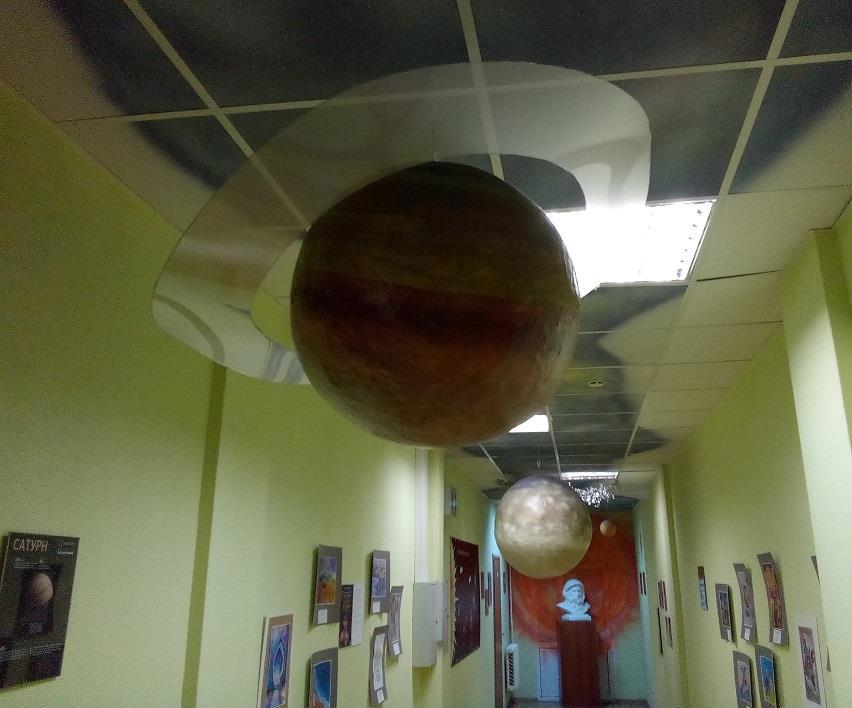 В это же время в нескольких аудиториях от нас шла лекция. Молодая преподавательница рассказывала о симбиотической теории происхождения эукариот. Этому я не удивился, подумал: студентов натаскивают. Удивление пришло, когда слушатели высыпали в коридор. Это оказались дети 8-10 лет, почти исключительно девчонки. Ну ни фига себе вундеркинды! Однако дети есть дети: в коридоре они тут же принялись прыгать, силясь достать рукой до макетов планет, свисающих с потолка. До Сатурна никто не достал, а вот до Юпитера самые прыгучие дотянулись. Жалею, что не успел это снять. А макеты вот: