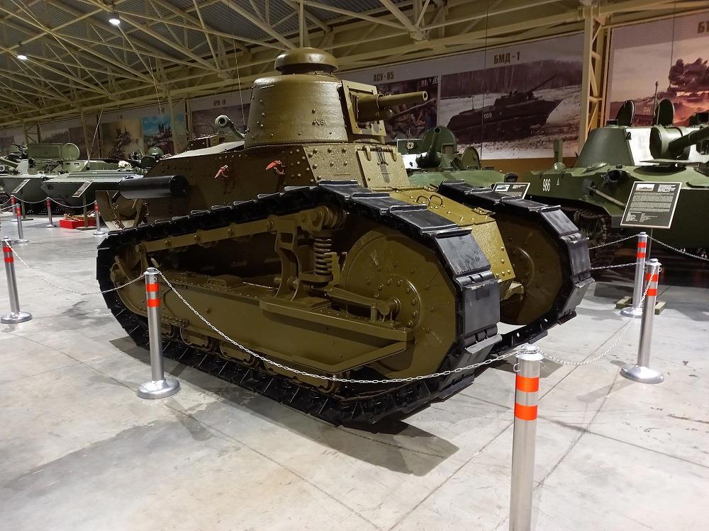 И в наше время, в современной России остался всего один танк. Что демонстрируется сейчас на Поклонной горе. Причём родной у него только корпус. Так как в 1938 году на полигон в Кубинке был доставлен корпус одного из первых трофейных танков типа «Рено» FT-17. Почему первых? А потому что с 1939 года пошла вторая волна трофеев этих машин. И именно с танка захваченного в Польше в 1939 года на него и установили башню. При этом ведущее колесо этого танка выполнено из дерева. Единственный случай применения этого материала в конструкции танков.