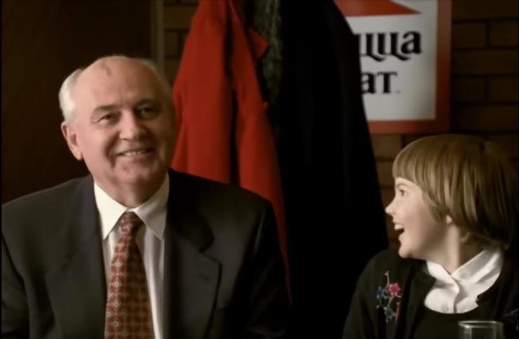 Рис. 11. Экс-президент в рекламе «Пицца Хат», вместе с внучкой Настей. Горби страну не продал, поскольку дивиденды в карман не положил. В рекламе, в возрасте 60+ лет, - от хорошей жизни сниматься не будешь. Если ты не актёр.
