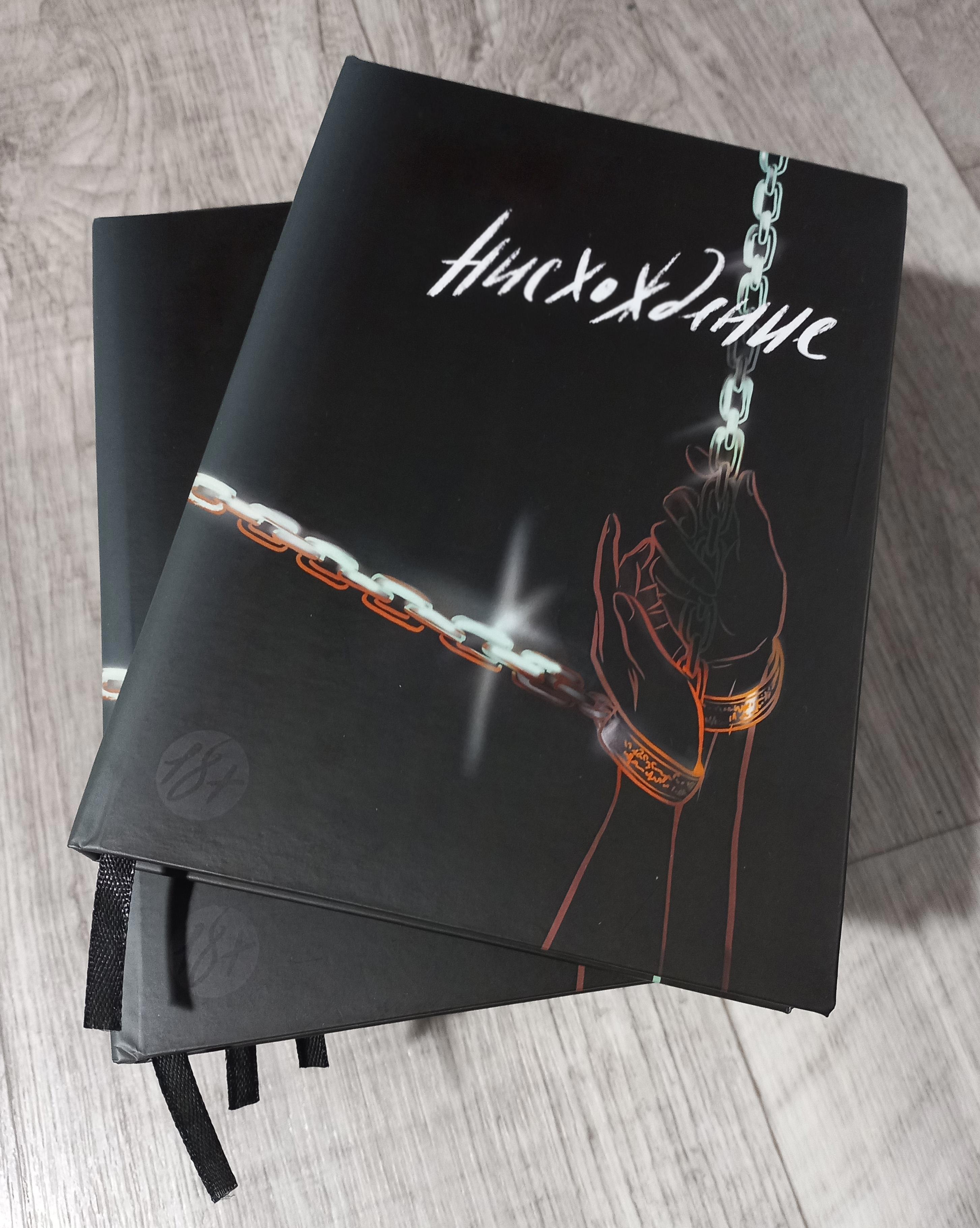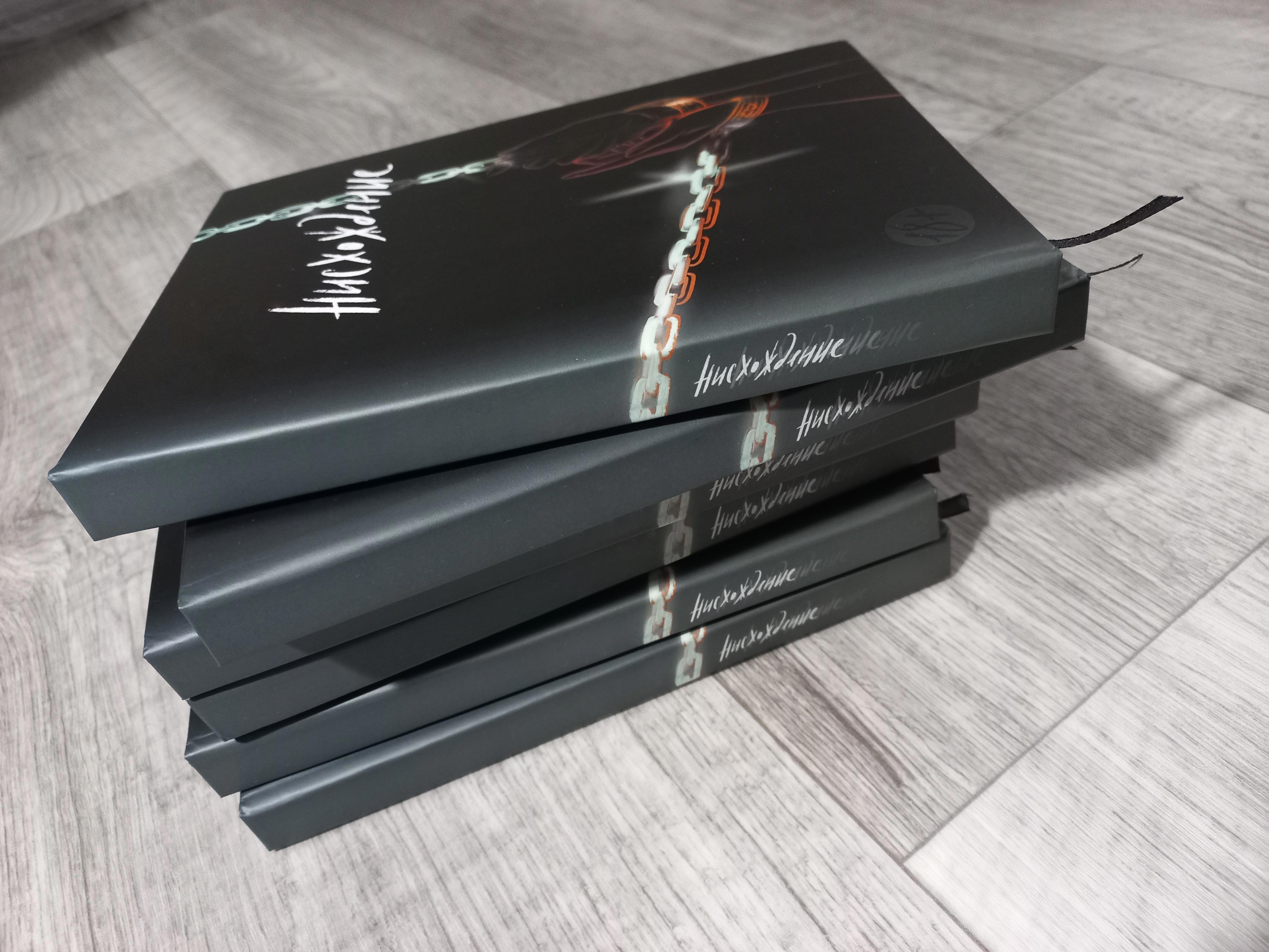 Шрифт и оформление я выбирала сама из предложенных Валерием примеров. По моей же просьбе все элементы книги были сделаны в черном цвете: закладка, капталы, форзац, нахзац, и даже верхний срез блока тоже покрашен черной краской. Просто блаженство. Вышло в стиле «нуар», как я и хотела. Книги отпечатаны на белой бумаге, не тонкой, 80 г/кв. м, сшиты вручную. Переплёт твёрдый книжный, 7БЦ.