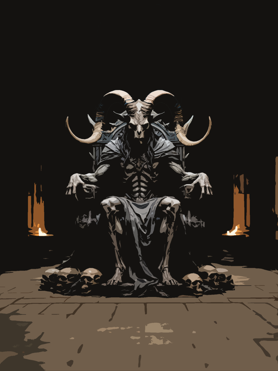 Лицо представляет собой странную смесь человеческого и звериного: высокий лоб, впалые щёки и резко очерченные скулы сочетающиеся с вытянутой нижней частью, где вместо губ — узкая прорезь, напоминающая оскал. Козлиные рога, массивные и закрученные, уходят вверх и в стороны, а на их поверхности выбиты имена — сотни имён, едва различимых в полумраке.