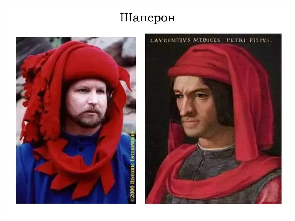 Мужчины носили шляпы из соломы и фетра с различной шириной полей и высотой тульи, береты, фески, шапероны (сложные драпированные шляпы с длинными спускающимися концами), чалмы и тюрбаны. Также на головы при выходе на улицу накидывали капюшон плаща.