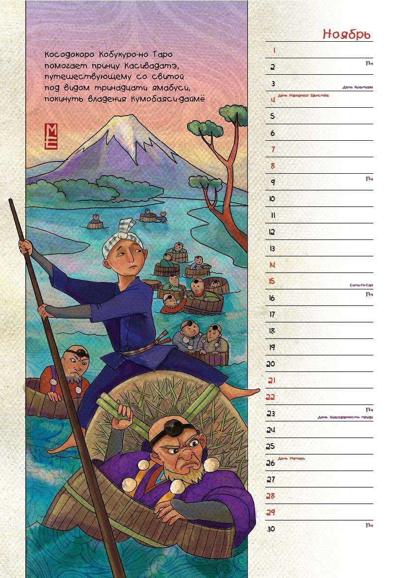Это как и прежде - 14 цветных листов формата А3 на пружинке с детства знакомыми сказками на японский лад на каждой странице, строчками для записей, российскими и японскими праздниками.