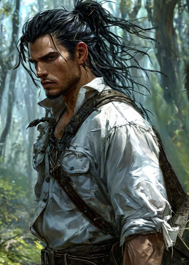 В несколько больших прыжков рядом с кабаном возник мужчина. Тот тяжело дышал, по-видимому, он бежал какое-то время, преследую добычу. Он был высок, это бросалось в глаза даже на расстоянии. Под свободной льняной рубахой угадывалась широкая грудь и сильные руки, выточенные тяжелой каждодневной работой. На запястьях их охватывали широкие кожаные наручи, подчеркивающие его красивые кисти с длинными, тонкими пальцами.
