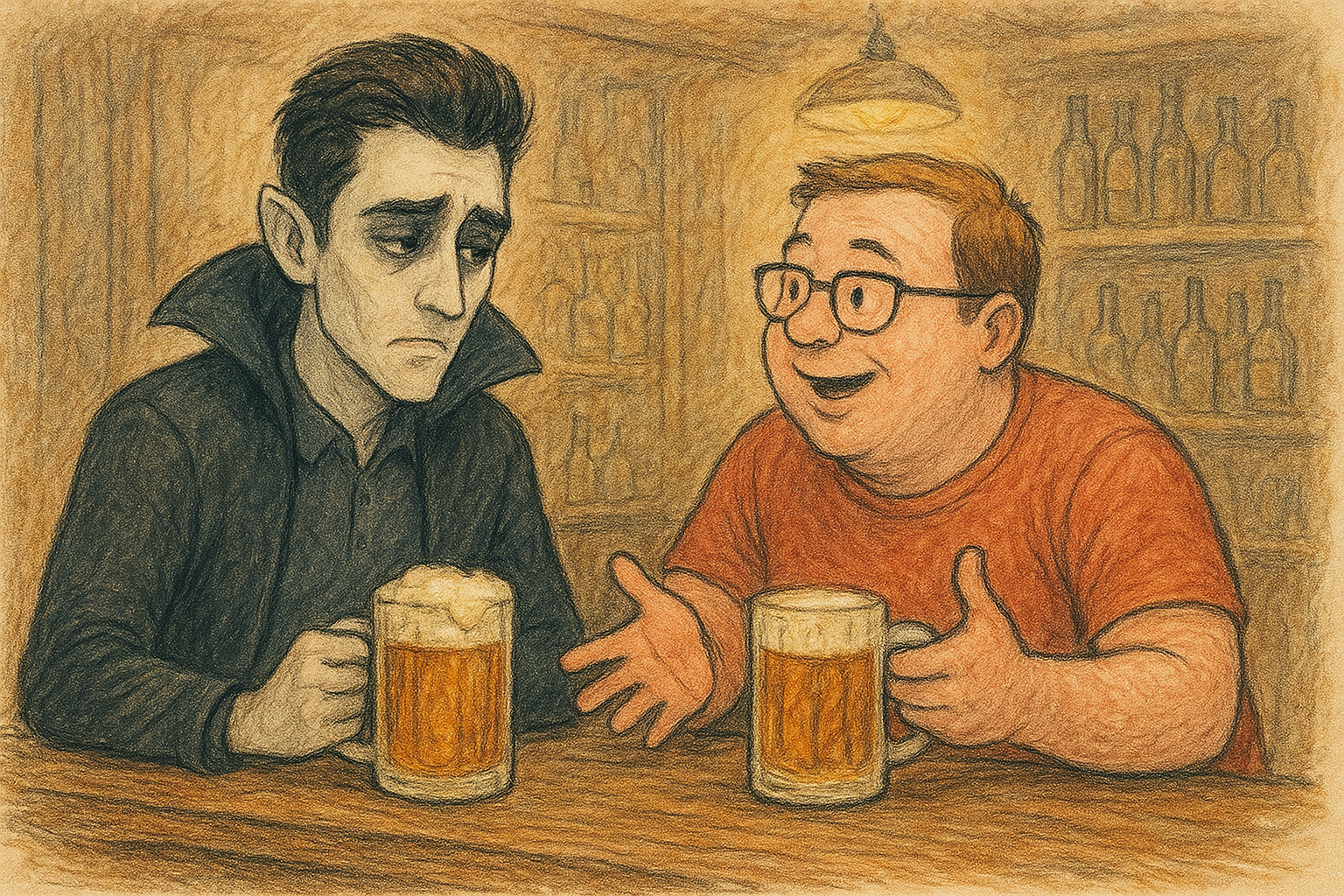 - А ты реально типа Дракула? Зубы покажешь? - он в ожидании смотрел на упыря, сидящего напротив.