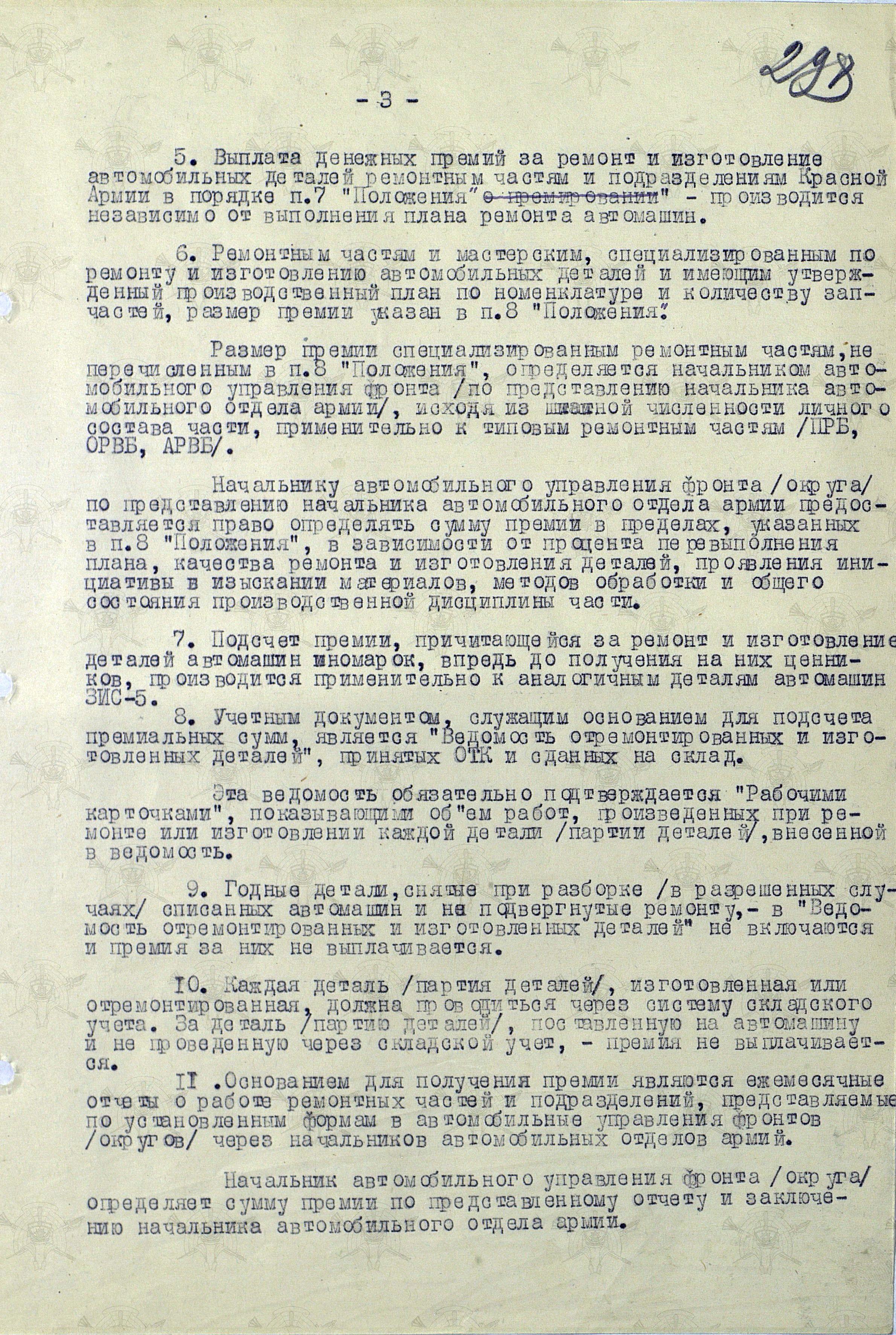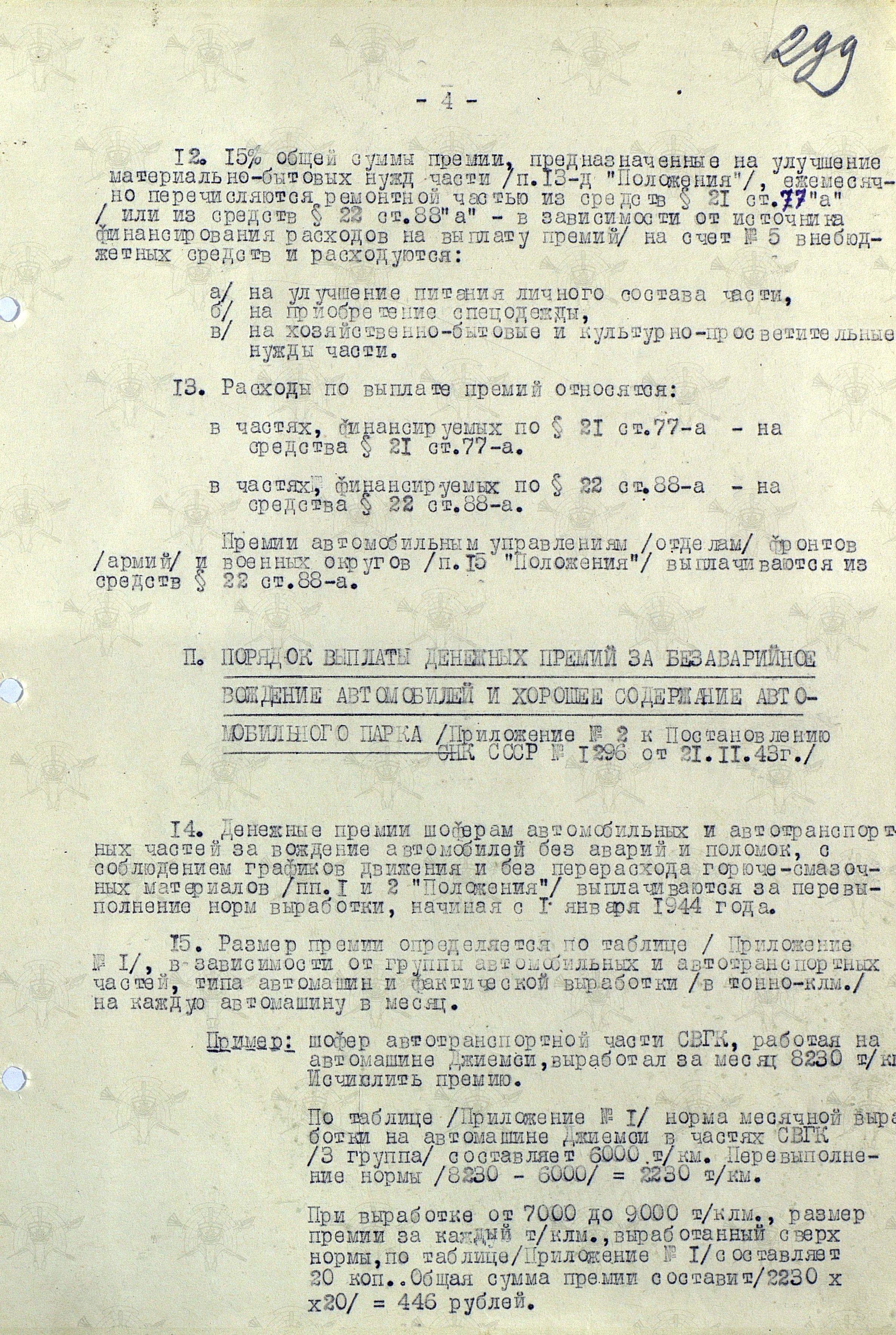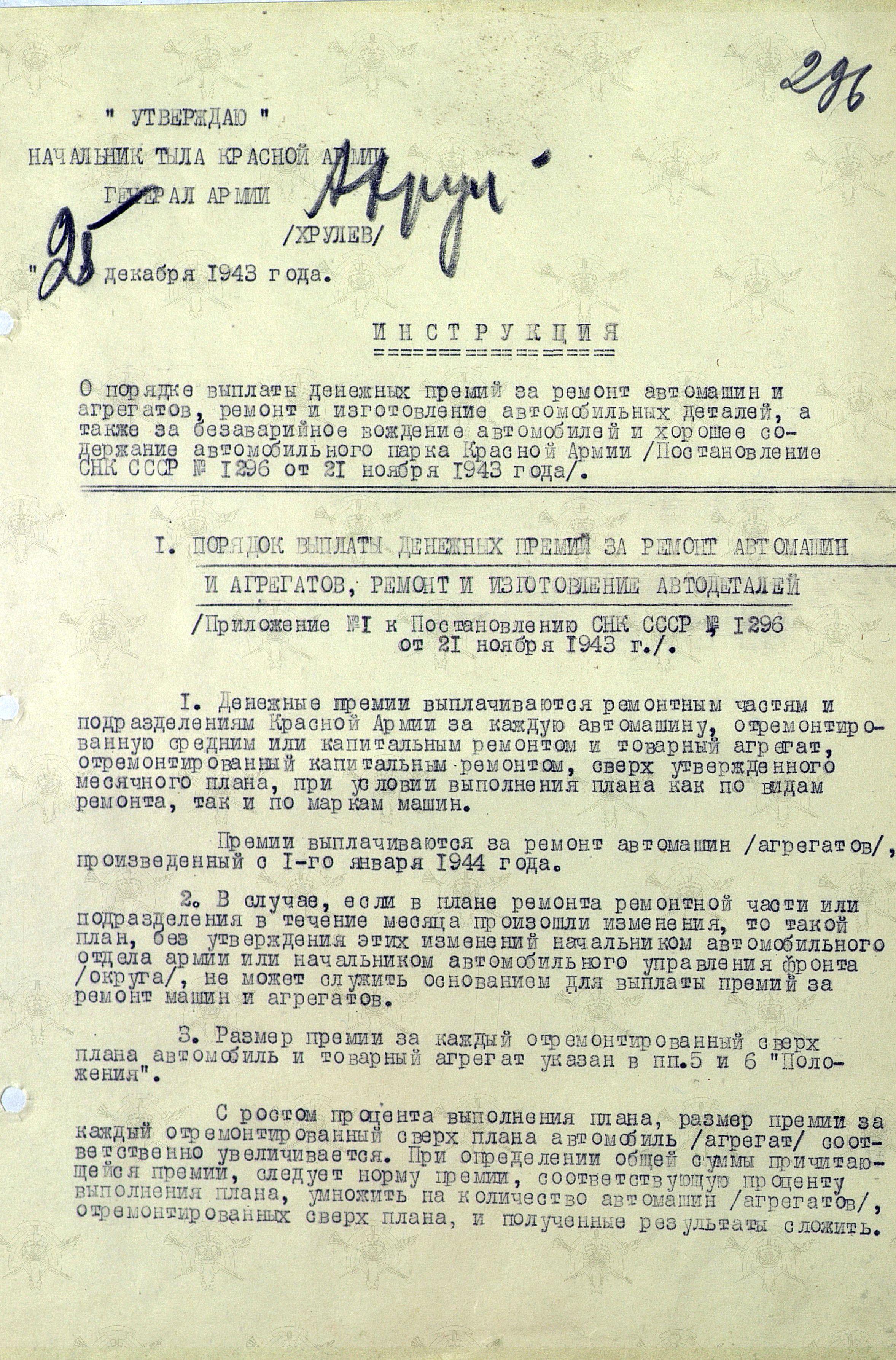 Мы же полистаем документ, утвержденный начальником Тыла Красной Армии генералом армии А.В. Хрулёвым 25 декабря, а точнее «Инструкцию о порядке выплаты денежных премий за ремонт автомашин и агрегатов, ремонт и изготовление автомобильных деталей, а также за безаварийное вождение и хорошее содержание автомобильного парка Красной Армии (Постановление СНК СССР № 1296 от 21 ноября 1943 года)».