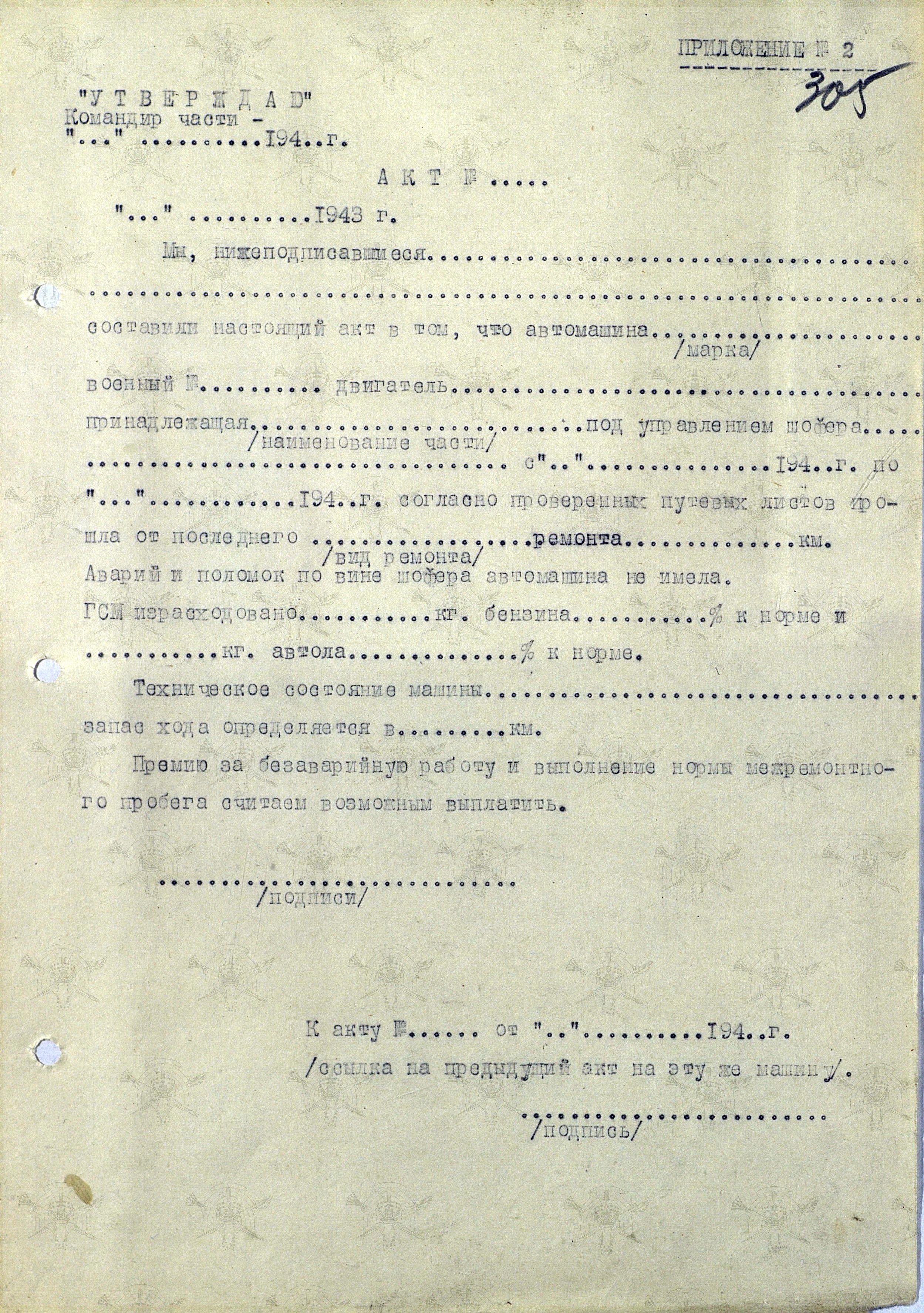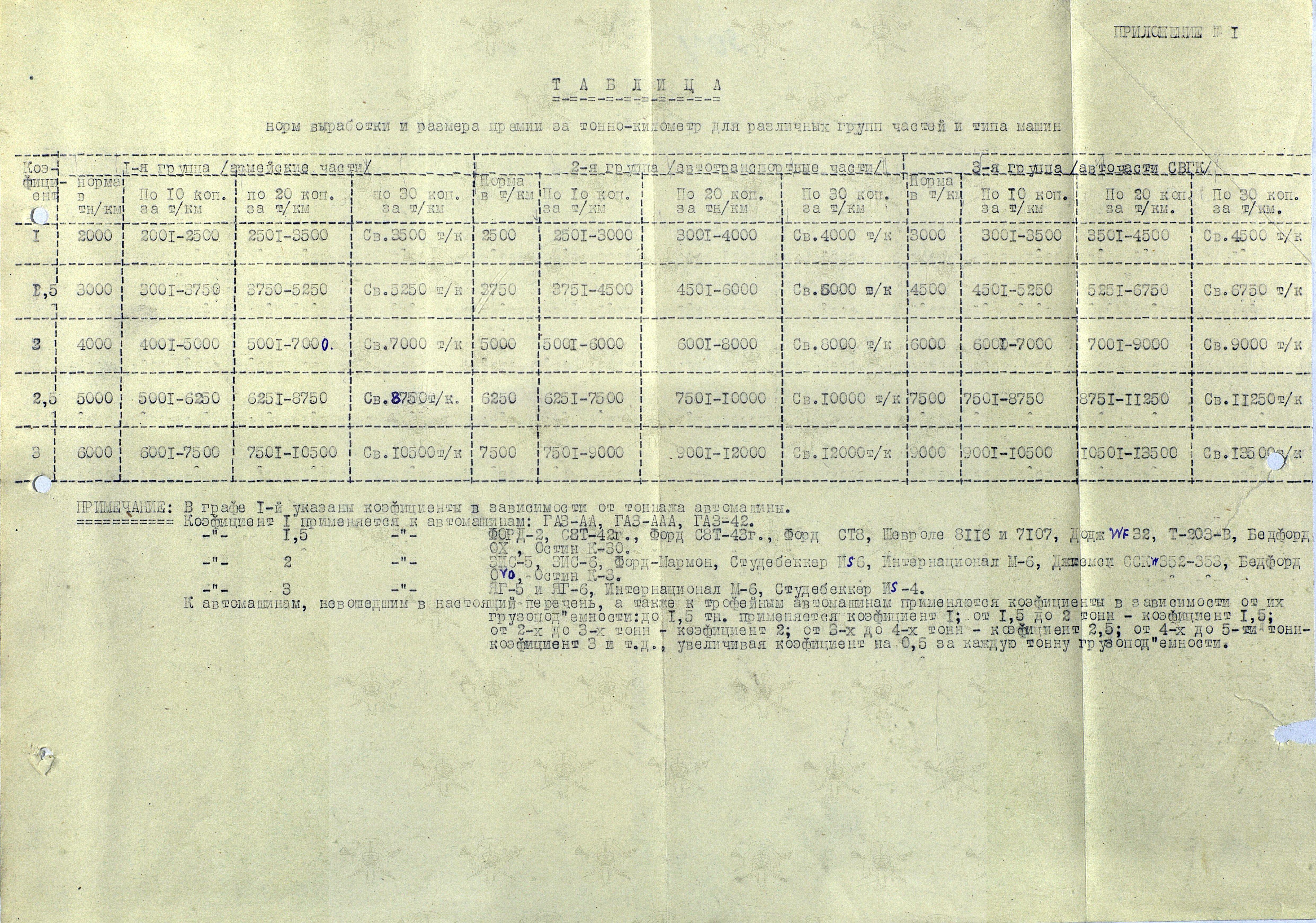 А вот приложения - содержат таблицы, к которым АТ относится очень уж отрицательно. Но и оба Положения, о которых и идёт речь в Постановлении можно изучить, если пройтись по ссылке: Постановление СНК СССР от 21.11.1943 N 1296 "Об установлении премиальной системы за перевыполнение заданий по ремонту автомобилей, за ремонт автомобильных деталей и за хорошую эксплоатацию автомобильного транспорта Красной Армии"