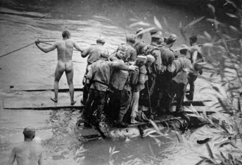 Группа советских солдат из состава войск 1-го Украинского фронта переправляется через реку Западный Буг на импровизированном пароме. 1944 г.