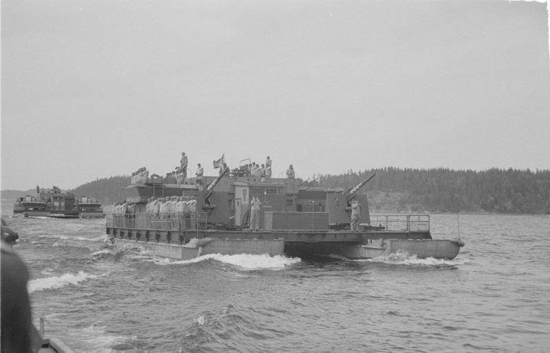 Построение личного состава легких паромов артиллерийской поддержки «Зибель» во время плавания в водах Ладожского озера возле Лахденпохьи. Как раз эта техника примет участие в неудачном десанте на остров Сухо. Карелия, 1942 г.