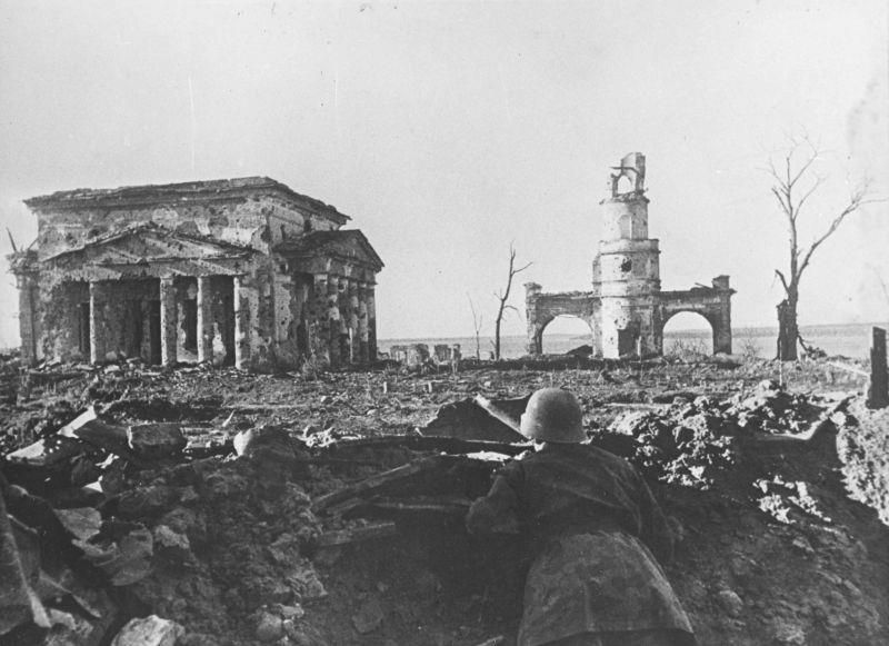 Немецкий солдат наблюдает из окопа напротив руин Воскресенской и Знаменской церквей Званского Знаменского женского монастыря. 1943 г.