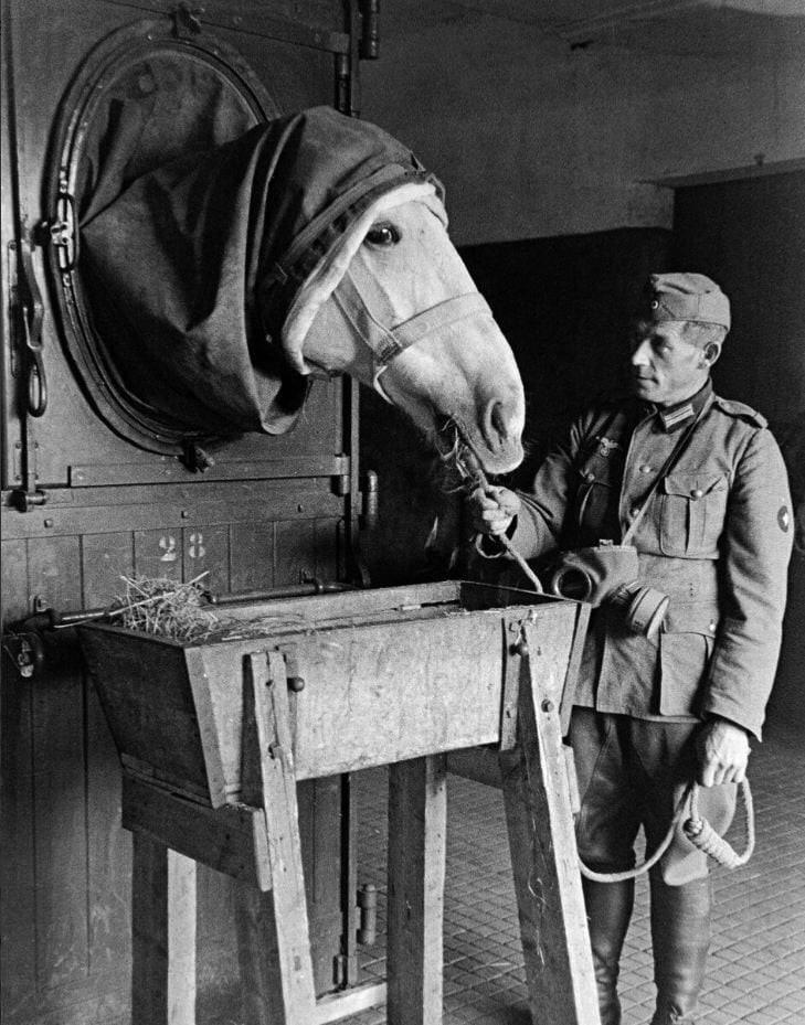 Снимок сделан в специальном немецком военном госпитале для лошадей в 1942 году. Вши, чесоточные клещи и другие паразиты представляли опасность для здоровья лошадей. Для борьбы с ними специальную деревянную кабину наполняли газом на основе серы и давали лошади угощение, чтобы она не нервничала, а спокойно хрумкала сено.