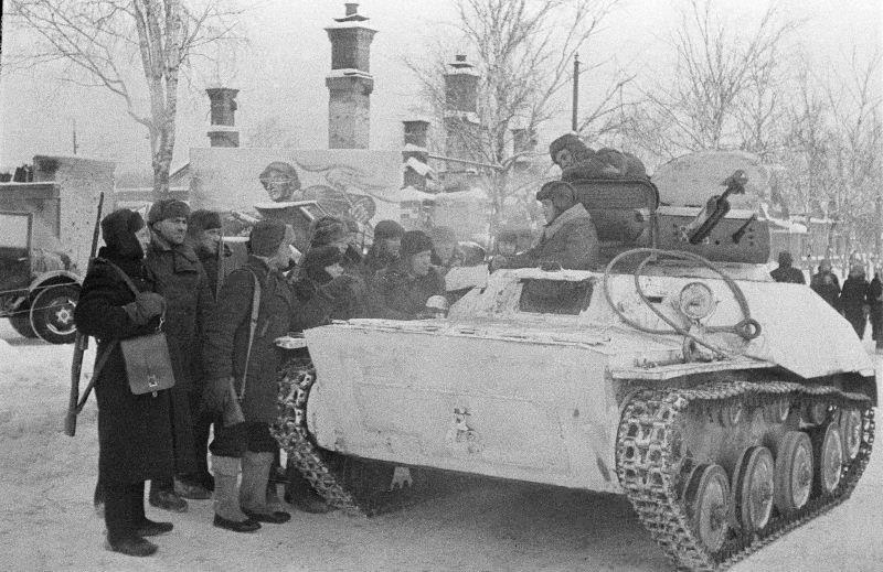 Бойцы партизанского отряда Наро-Фоминска показывают на карте танкистам на танке Т-40 дорогу в Боровск. Зима 1941 — 1942 гг.