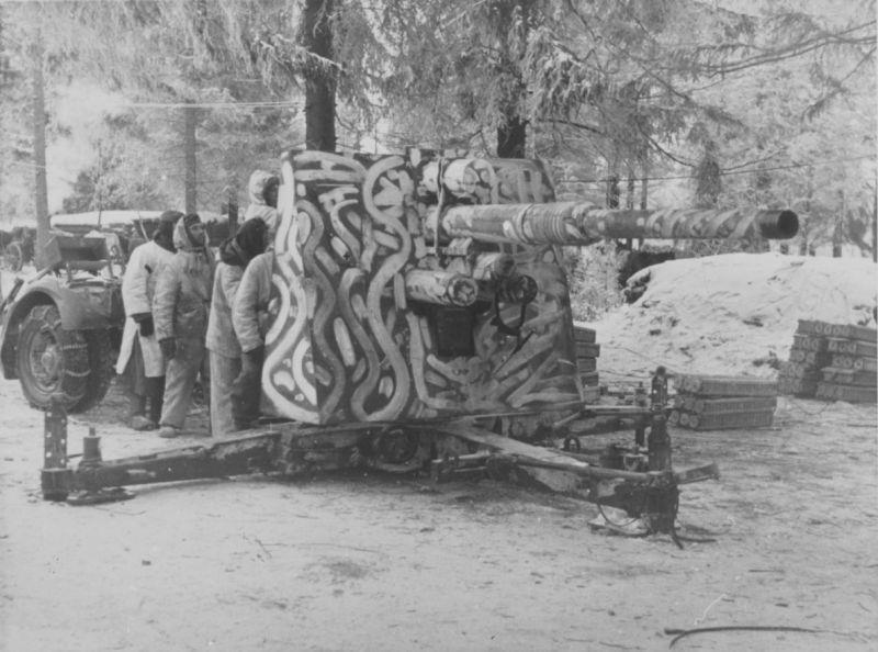 "Амбарные ворота". Закамуфлированная немецкая 88-мм зенитная пушка FlaK 36 на позиции на Восточном фронте. 1943