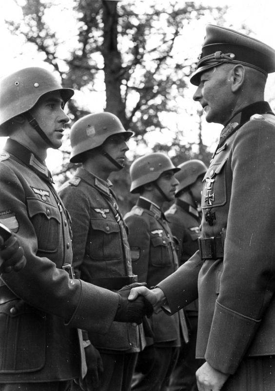 Генерал кавалерии Филипп Клеффель, командующий 50-м армейским корпусом приветствует офицеров 250-й (испанской) дивизии вермахта (División Azul, «Голубая дивизия»). 1943 г. Как и положено - потери этой дивизии тоже не известны и "оцениваются приблизительно". По советским данным - состав этих голубых сменился несколько раз.