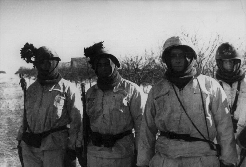 Итальянские берсальеры (пучки петушиных перьев на касках) зимой в России 1941 года. Редкое это фото потому, что они тут в зимнем обмундировании и даже маскхалатах, что для италийцев тогда было редкостью.
