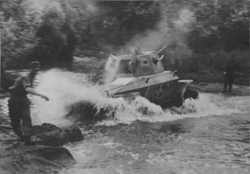 Венгерский легкий бронеавтомобиль 39М «Чаба» из 1-й моторизованной бригады форсирует водную преграду на Украине. 1941 г.