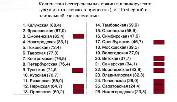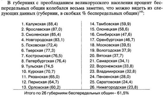 Автор: falesОбщим местом является мнение, что великорусские крестьяне жили в передельной общине, где периодически устраивались переделы земли. Но это заблуждение - как обнаружилось (после начала столыпинской реформы, когда этим вопросом заинтересовались власти) в большинстве великорусских крестьянских общин земельных переделов не было с 1861 года (а во многих общинах переделов вообще никогда не было). В таблицы (из книги В.Тюкавкина "Великорусское крестьянство и столыпинская аграрная реформа.") приведено соотношение беспередельных и передельных общин по великорусским губерниям