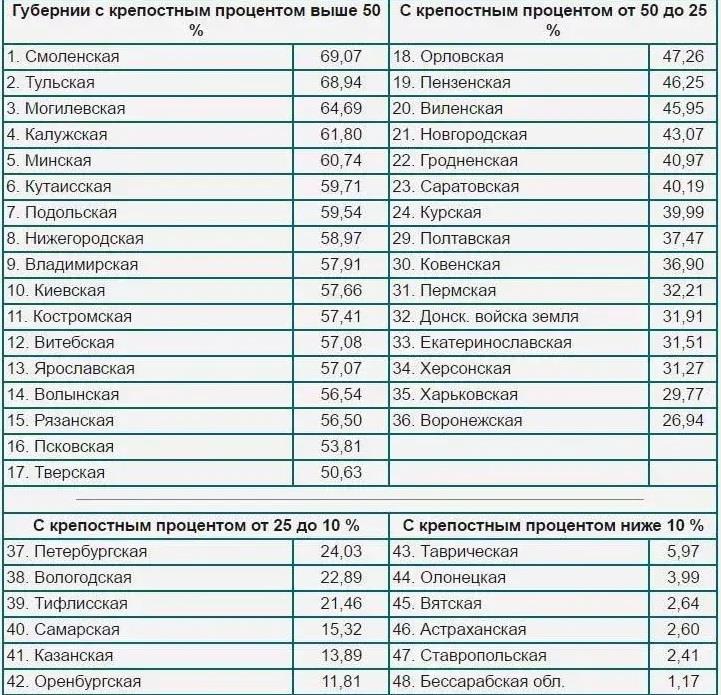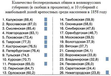 Традиционно причиной всех бед считают крепостное право. Если совместить таблицу с десятью губерниями имевшими в 1858 году наибольшую долю крепостных, среди населения, то картина будет следующая