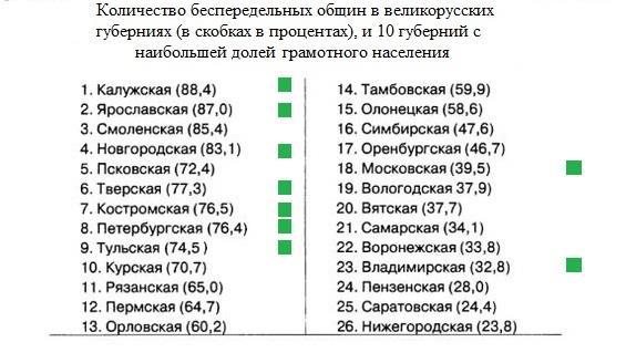 Здесь без особых сюрпризов. Чем грамотней население - тем меньше переделов земли. Опять так наиболее грамотными оказались губернии с развитым помешичьим землевладением (и преобладанием бывших крепостных в населении). Губернии исторически заселенные свободным крестьянством (олонецкая, вятская...) демонстрировали очень низкий уровень грамотности.