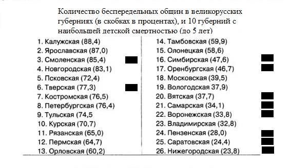 Ожидаемо высокая рождаемость в деревне 19 века коррелирует с бедностью и отсталостью. В развитых губерниях имеют меньше детей, но о детях лучше заботятся, так что детская смертность меньше. Переделы земли естественно подстегивали рождаемость - крестьяне делали детей, чтоб получить больше земли при переделах