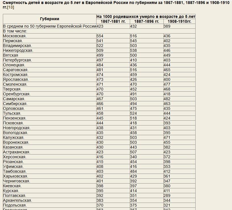 Так как был огромный недоучет детской смерности в деревне (детей умерщих при рождении просто не регистрировали нигде), данные взяты за период 1908-10 год как наиболее точные