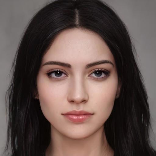 красивое удлинённое лицо, большие тёмно-карие глаза, чёрные длинные волосы.Рост средний, хрупкая, изящная, но не худая.