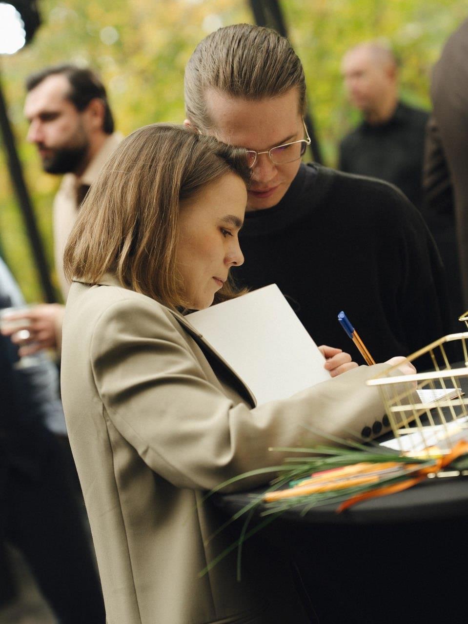 Мы получили фото от фотографа со свадьбы подруги. Тут мы с мужем записываем наши пожелания.