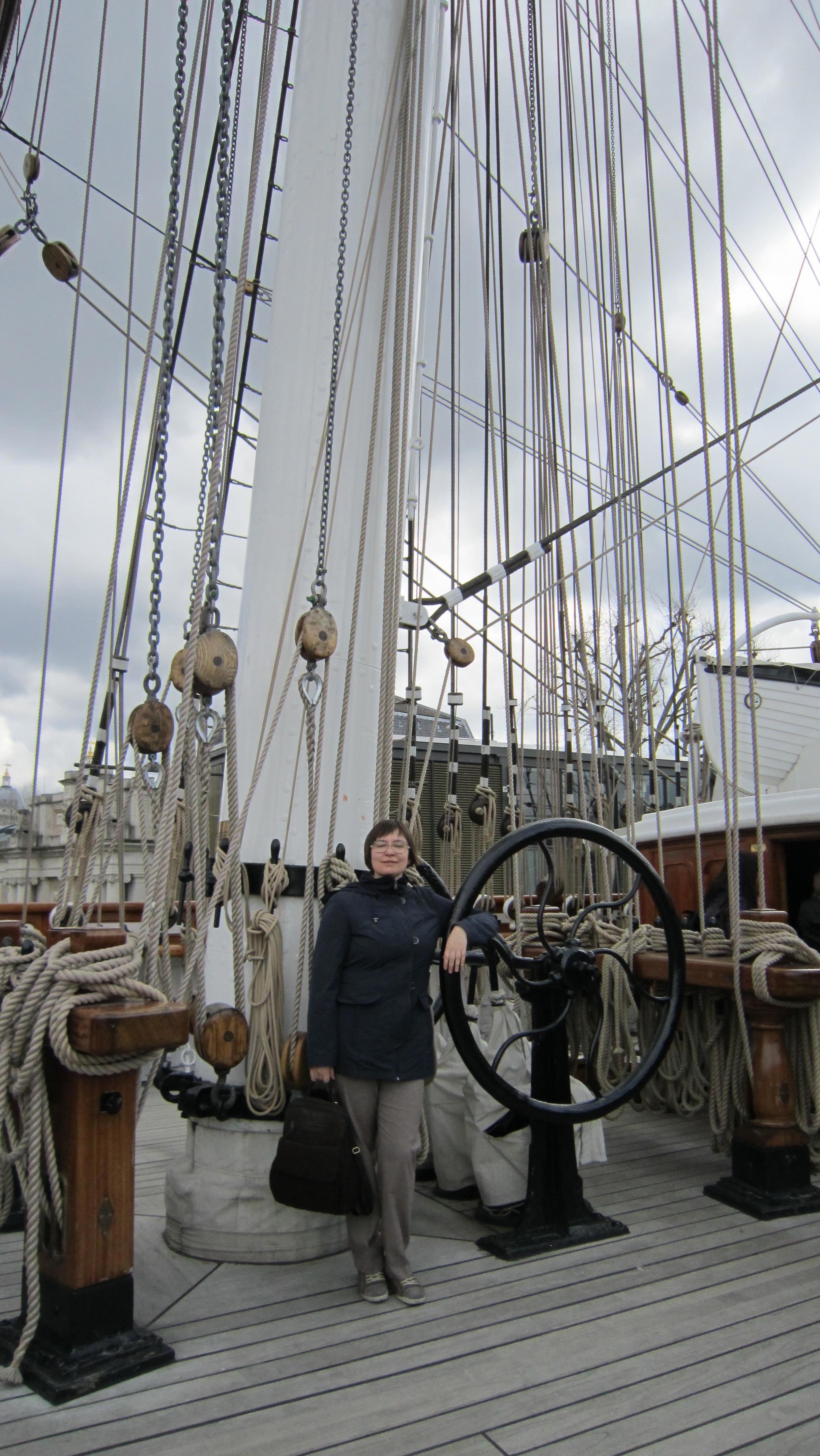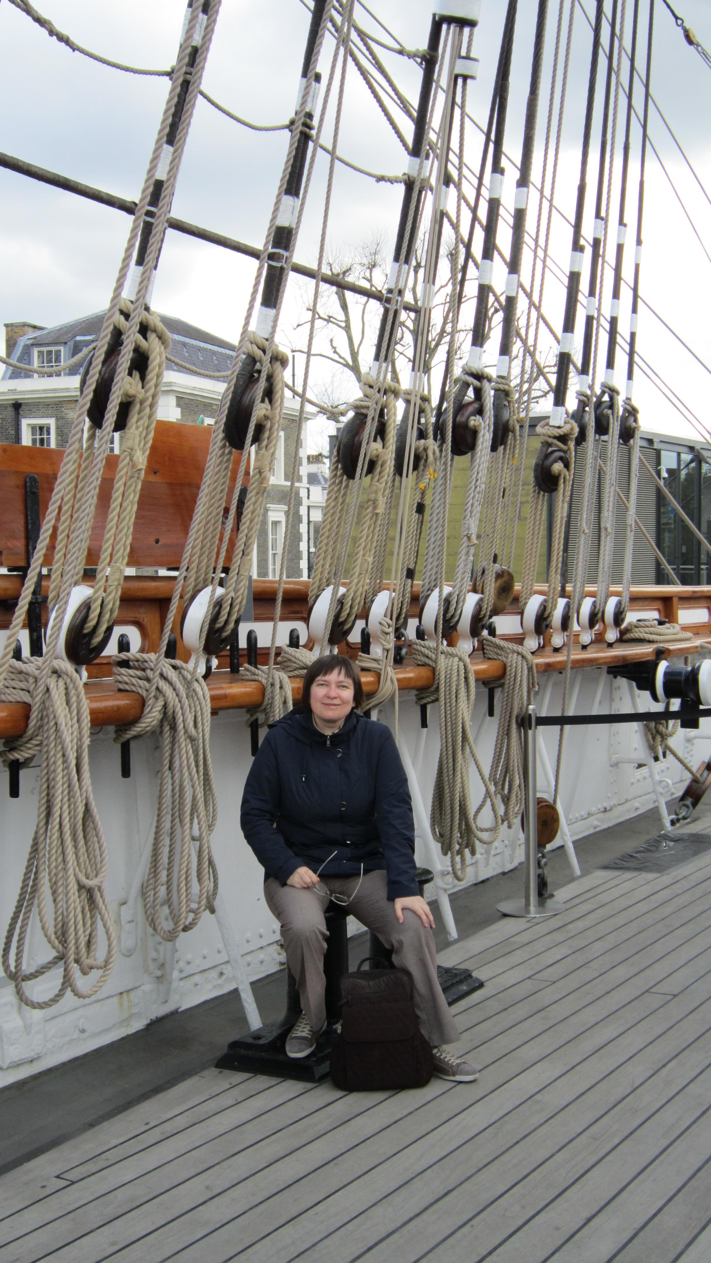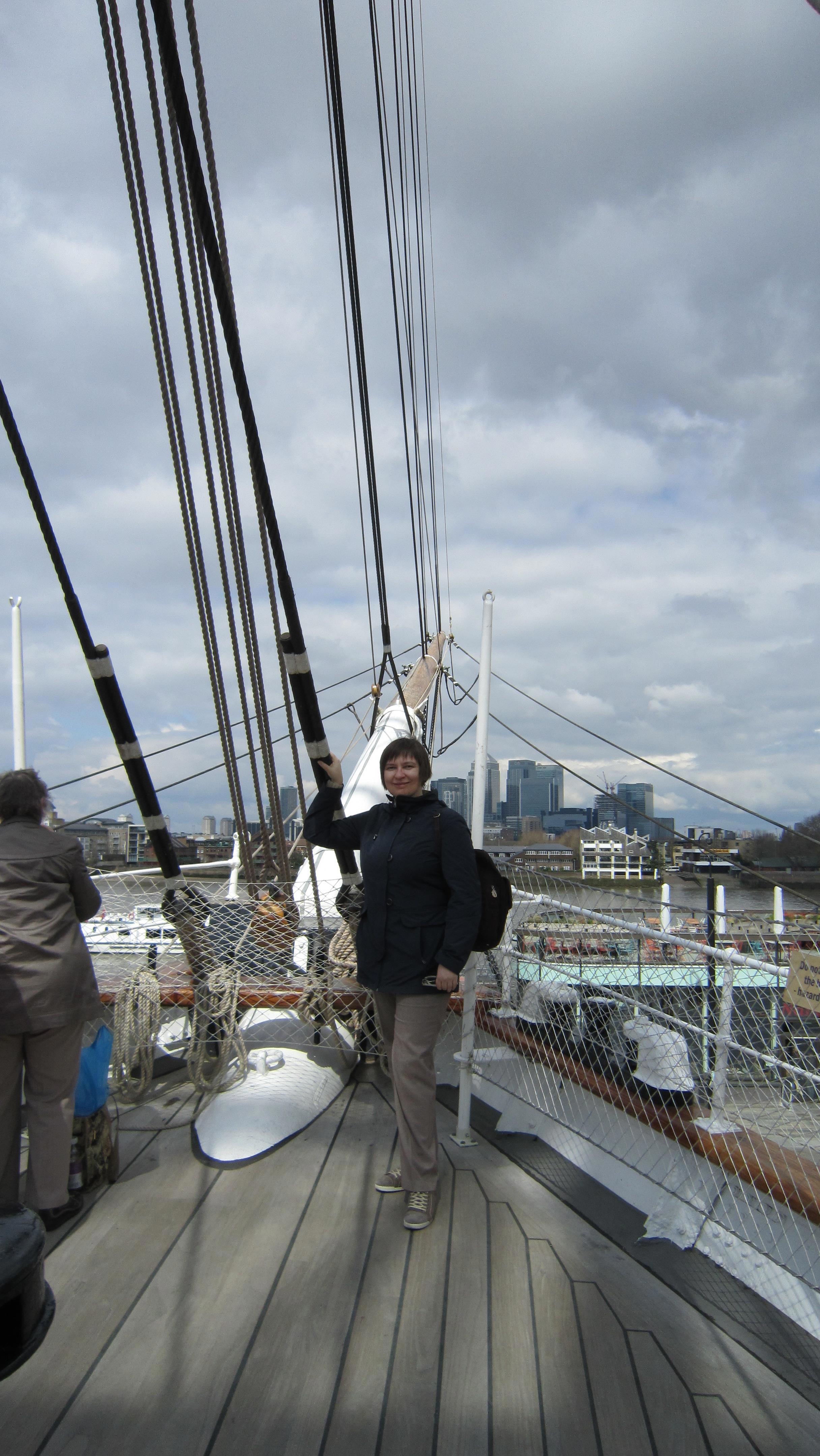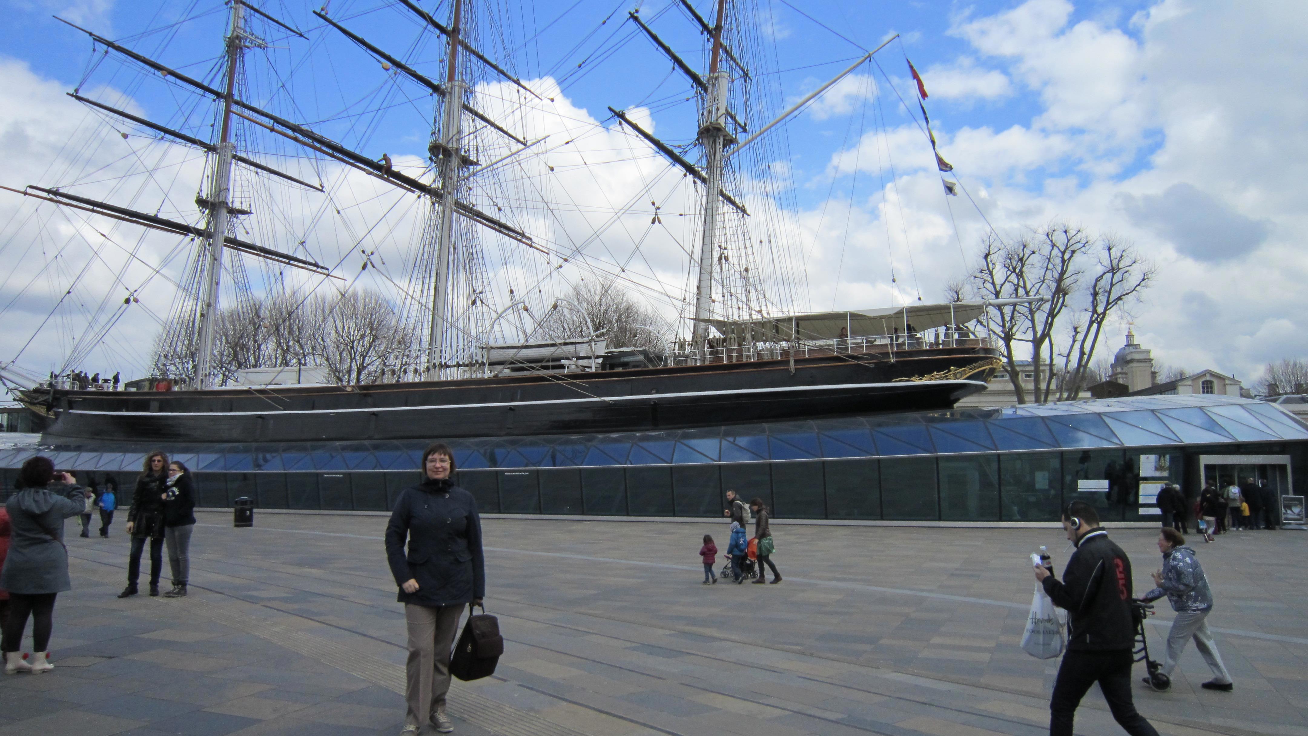 Это Гринвич, "Катти Сарк". Память меня подвела, она не вся в павильоне, стеклянная крыша имитирует поверхность воды, то есть, попадая в павильон, ты смотришь на корабль из-под воды. Почувствуй себя русалкой. Ну и таки я тут несколько толще, но, к счастью, речь не обо мне. Кстати, это апрель, люто холодно, надвигается холодный фронт с градом, так что на мне шотландский свитер, и я ему очень рада.