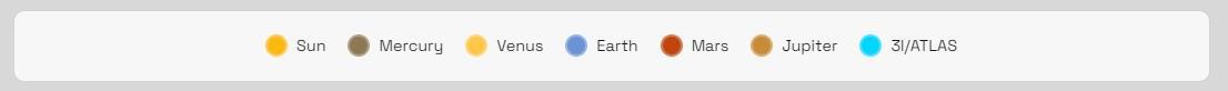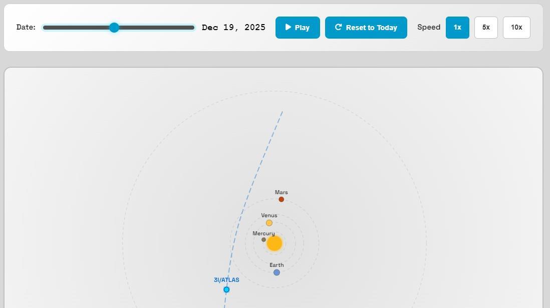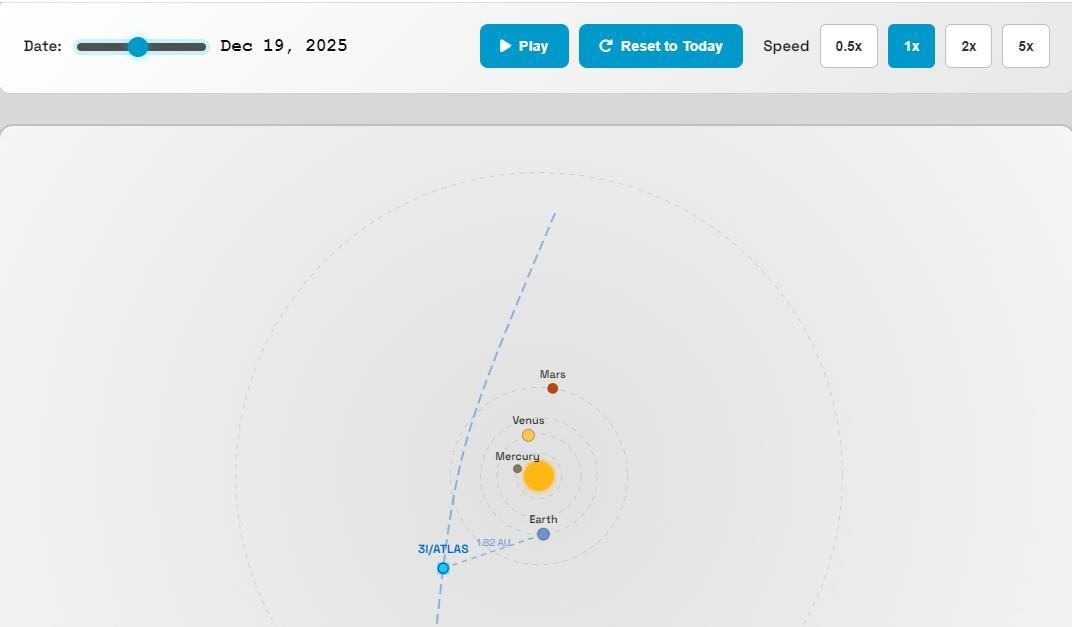 Прохождение мимо Юпитера, даже будучи очищенным от конспирологических теорий, представляет одну из самых замечательных особенностей орбиты 3I/ATLAS. Если мимо внутренних планет данное тело, с перигелием около 200 миллионов км, просто было обязано пройти на относительно близком расстоянии, то пересечения с внешними планетами строго говоря, по теории вероятности, быть было не должно. Ранее объект уже прошел на огромном, более миллиарда км, расстоянии от Нептуна и Сатурна, а в 2027 году пройдёт опять же на дистанции более миллиарда км от Урана. На этом фоне сближение с Юпитером на около 50 млн. км. выглядит совсем короткой дистанцией, особенно на фоне длины орбиты Юпитера, составляющей около 5 миллиардов км. На видео это сближение выглядит совершенно завораживающим. Два тела (межзвездный гость и крупнейшая планета около Солнца), словно сговорившись, летят навстречу друг другу, расходясь, практически, в последний момент.