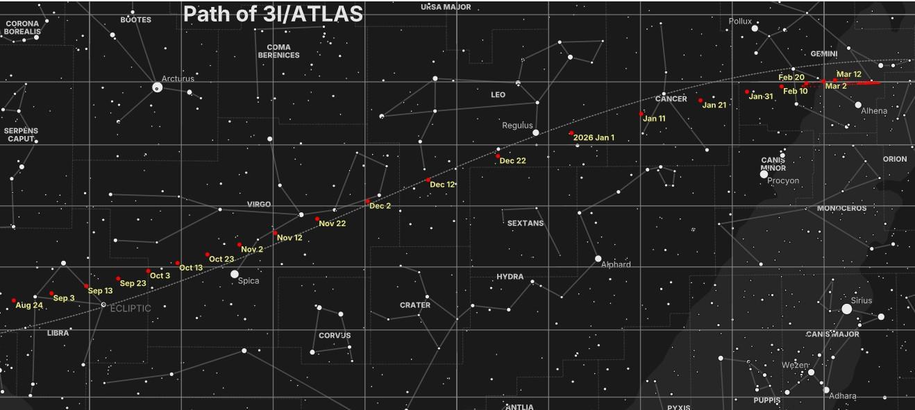 Видимый путь кометы 3I/ATLAS на земном небе с 2024 по 2026 год. Положения кометы с интервалом в 10 дней отмечены красными точками и подписаны соответствующими датами жёлтым цветом. Путь начинается в созвездииСтрельца слева и заканчивается в Близнецах справа. Видимые петли на концах траектории вызваны параллаксом, возникающим из-за движения Земли по орбите вокруг Солнца.