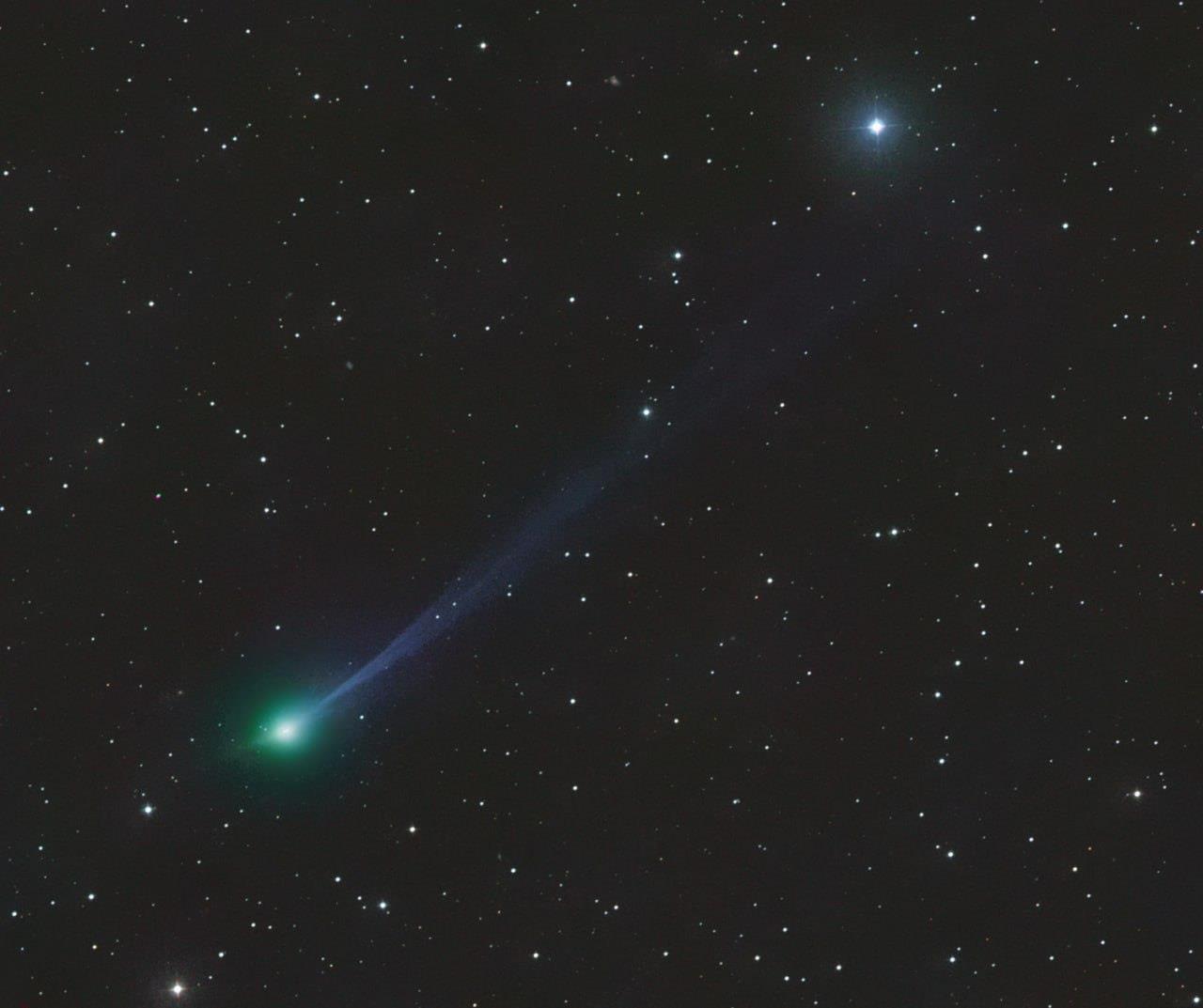 Конечно, и без фоточек не обходится (прилагаю снимок М. Егера (https://spaceweather.com/archive.php?view=1&day=22&month=11&year=2025)). Главная деталь – голубой, внешне типичный для «наших» комет газовый хвост; его цвет определяется флуоресценцией «быстрых» ионов CO+, которые успевают перетечь в хвост до своего разрушения.