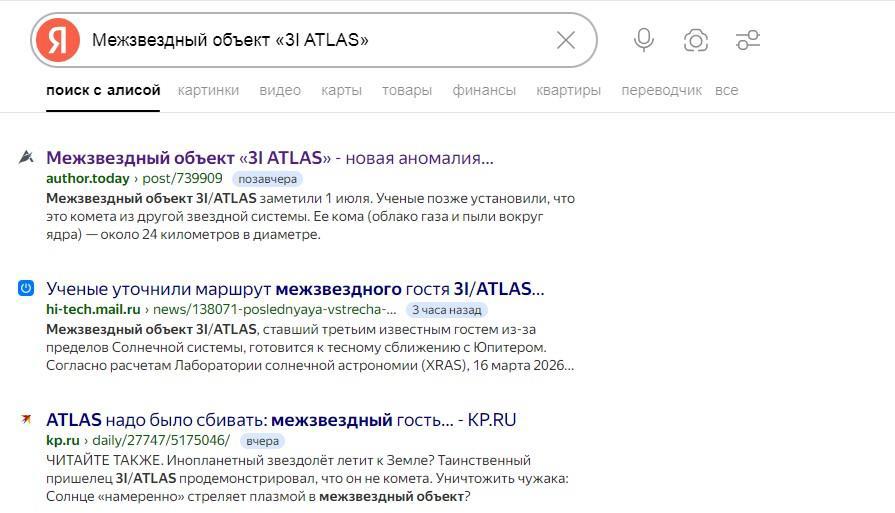 Наши блоги в Поисковиках - регулярно в ТОП-10/50: https://ya.ru/search/?text=Межзвездный+объект+«3I+ATLAS»&lr=213