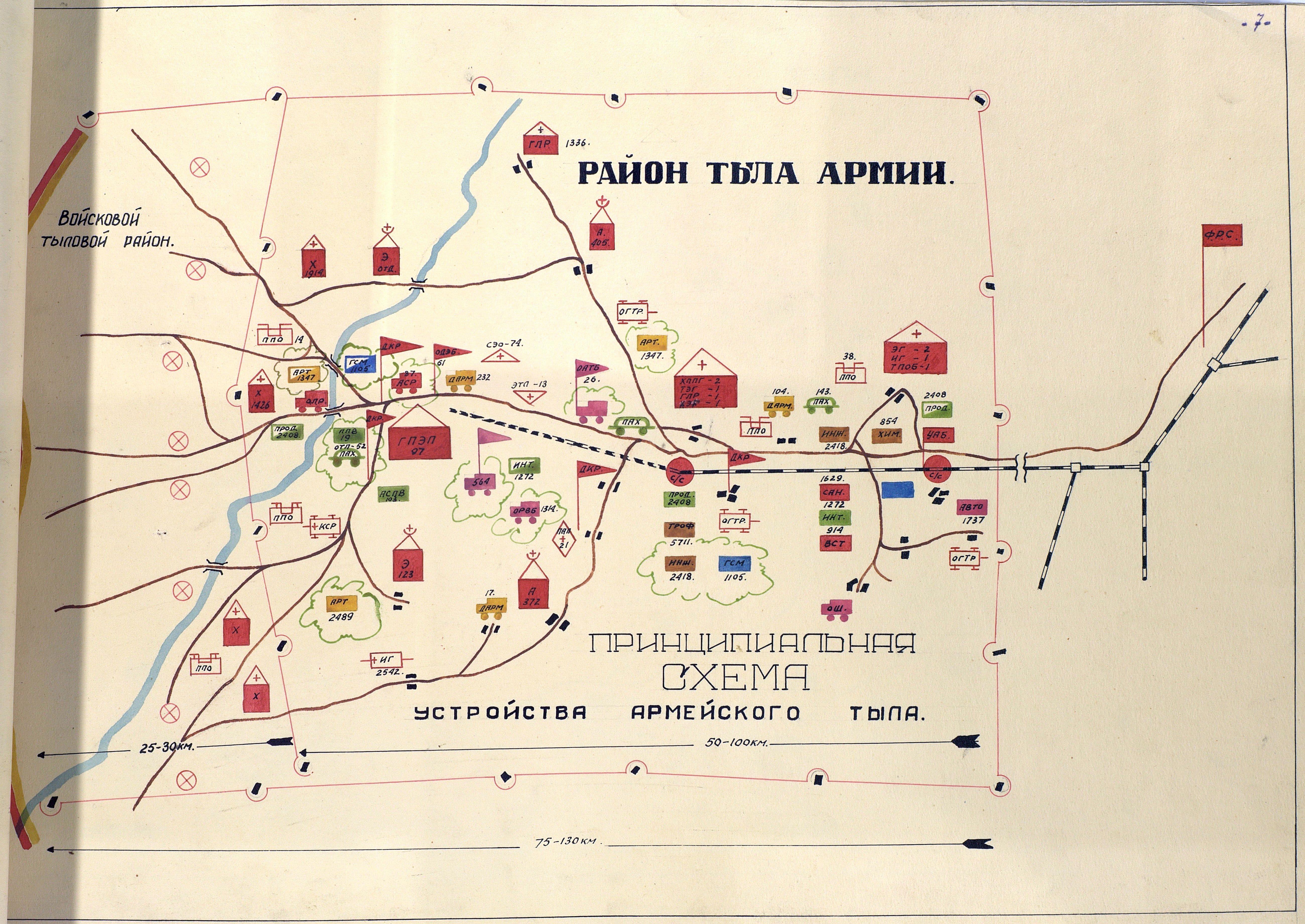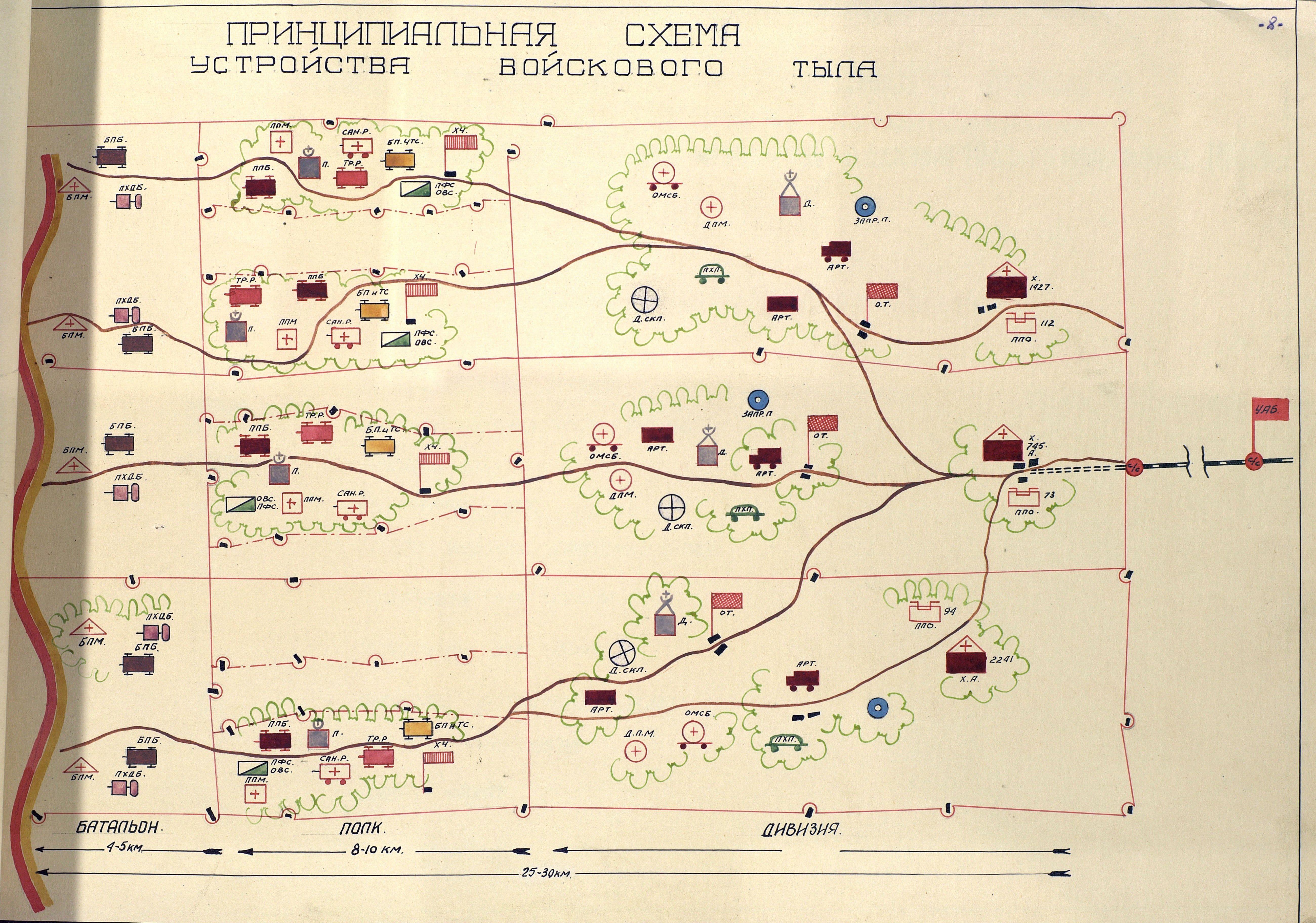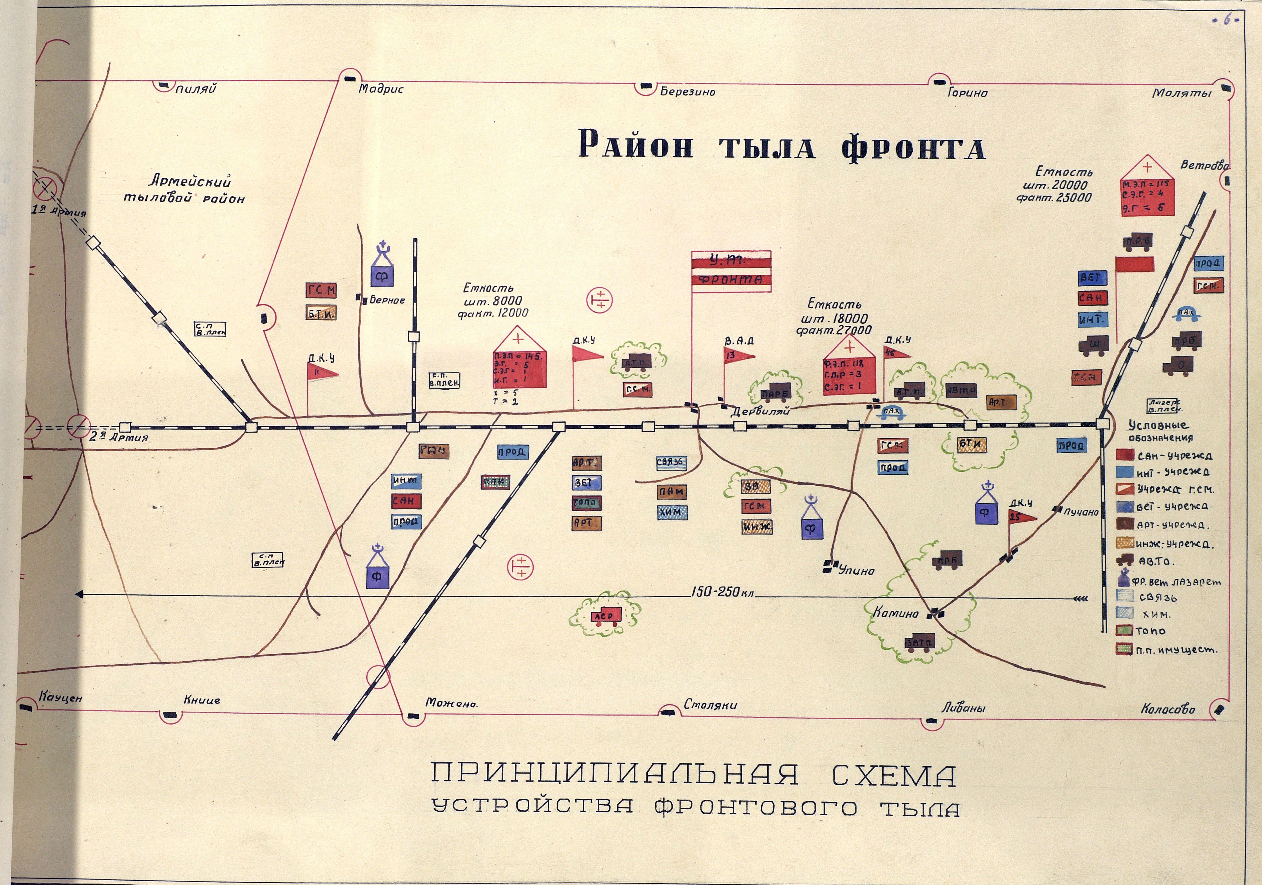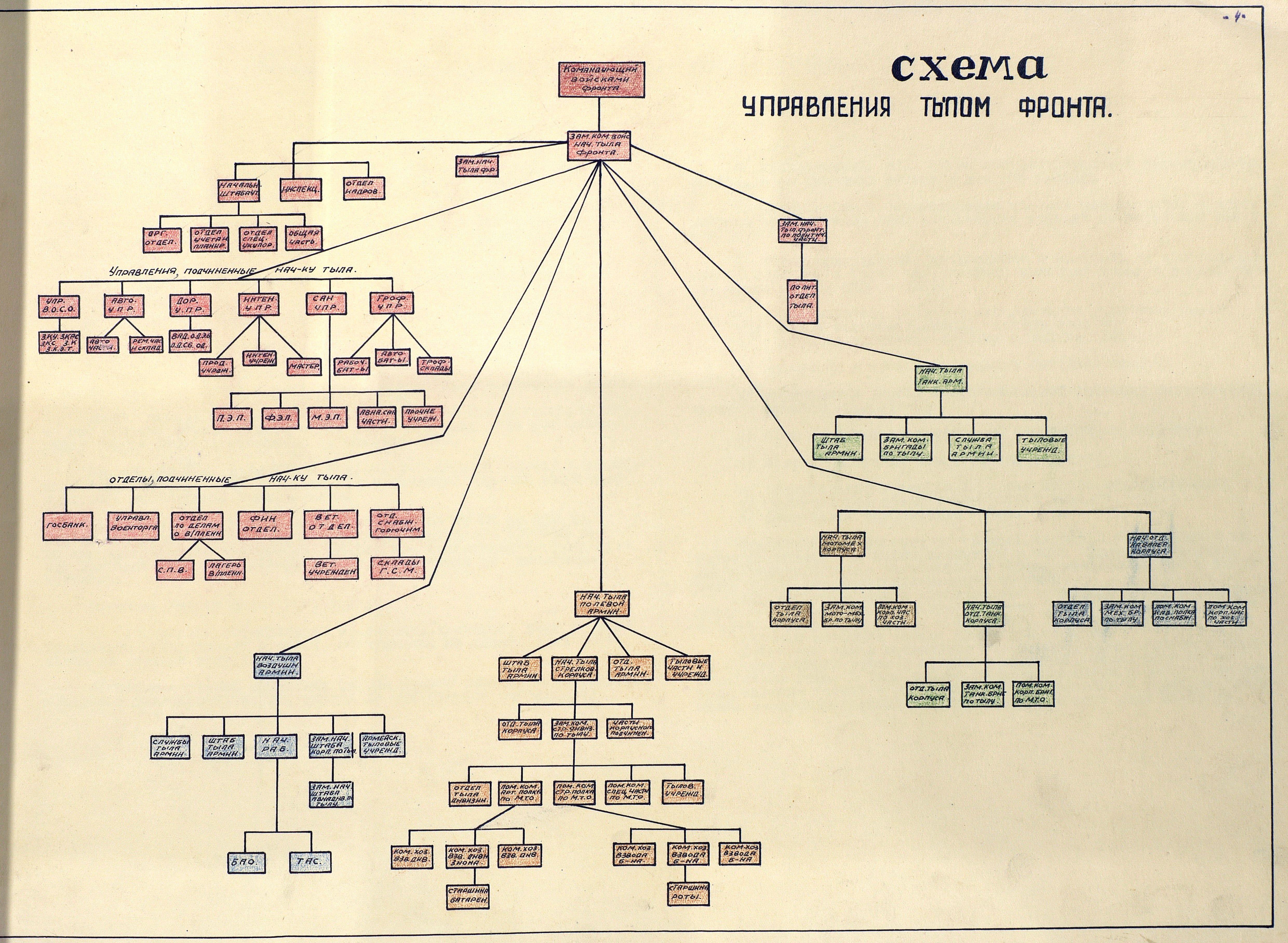 Конечно же, желательно чтобы и эти схемы были более подробными, раскрывали вопросы построения не только фронтового и частично армейского тыла, то есть отражали построение системы на две ступени ниже. Но, принципиальная схема устройства войскового тыла была дана выше, и существенных изменений в ходе сражений не происходило. А подробнее о войсковом тыле мы ещё обязательно поговорим, при рассмотрении проектов наставлений, посвященных этому вопросу.
