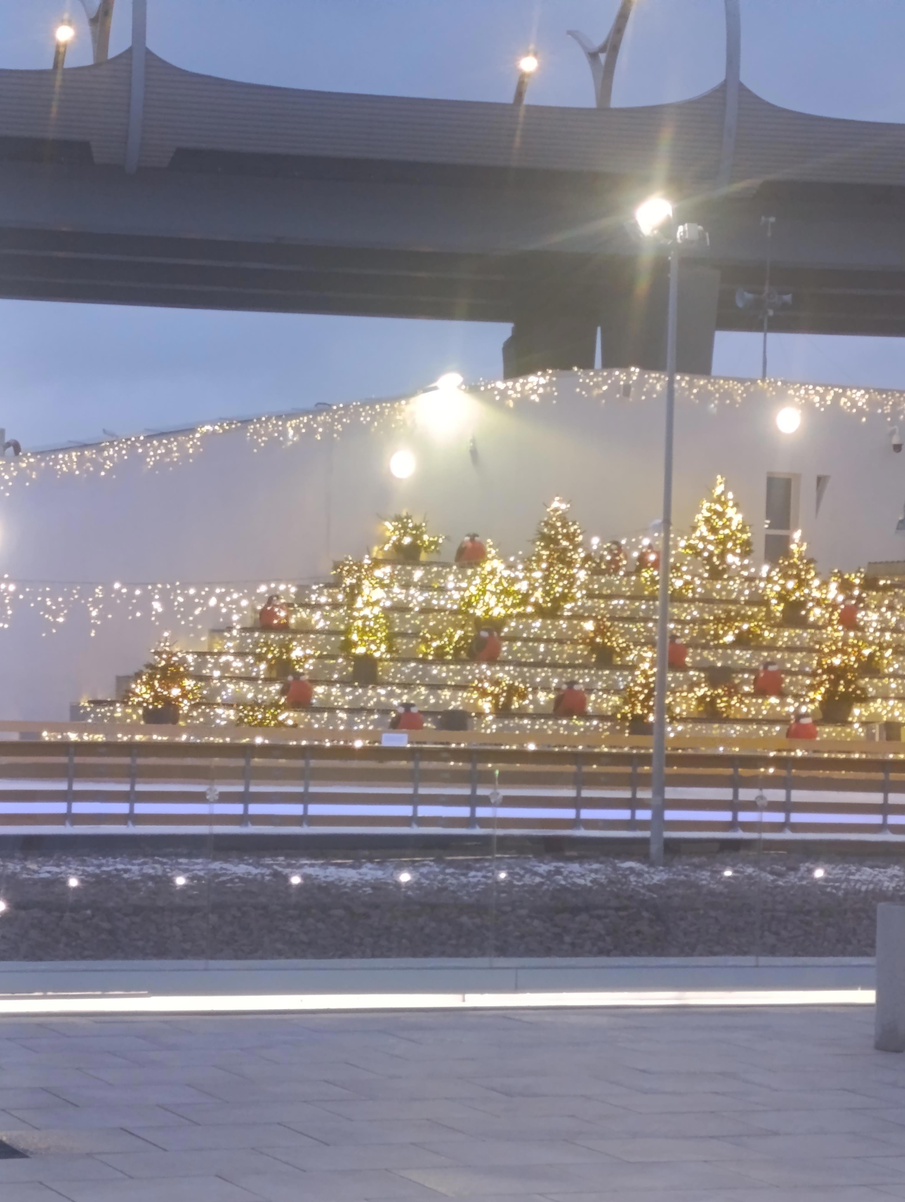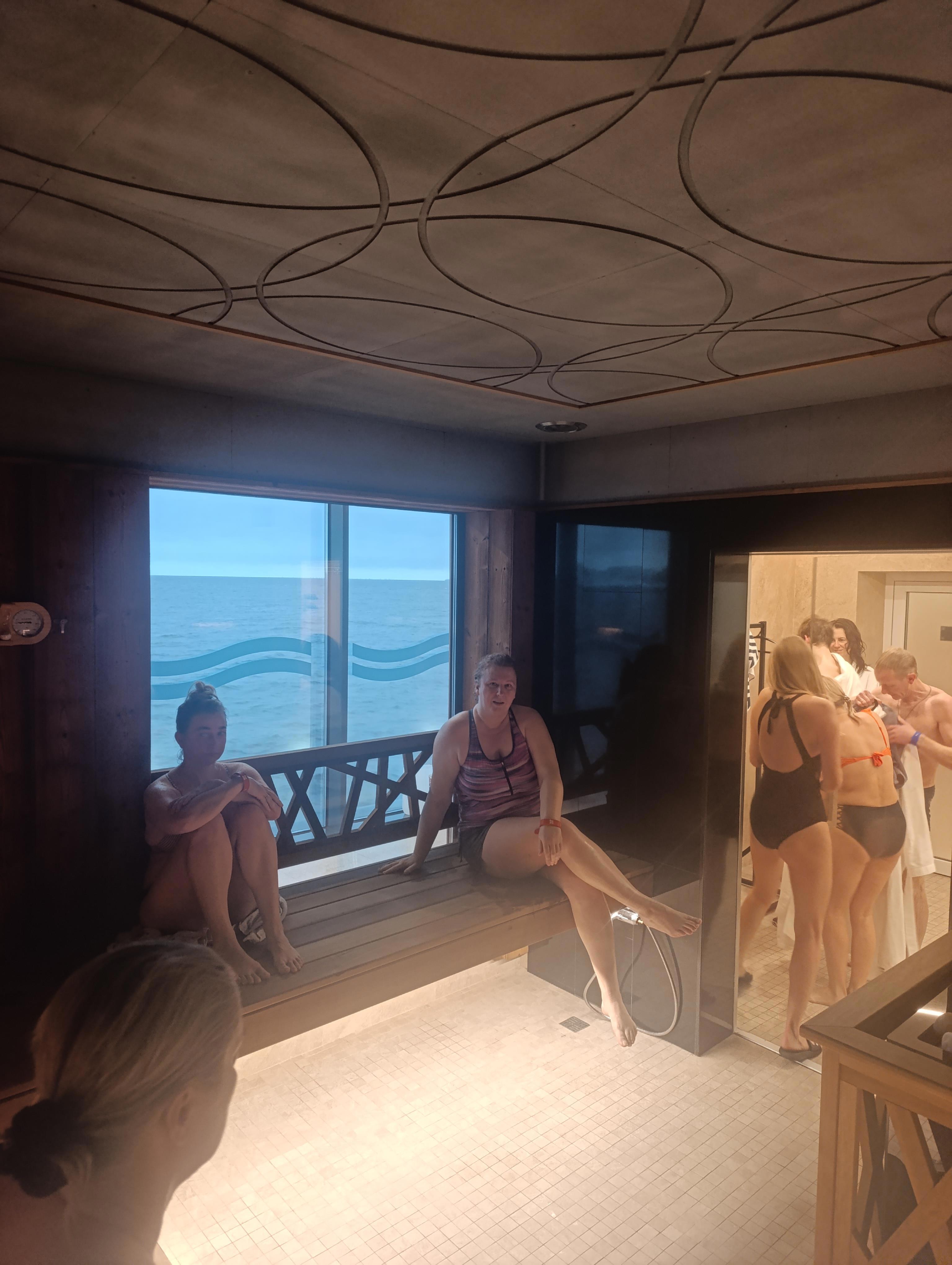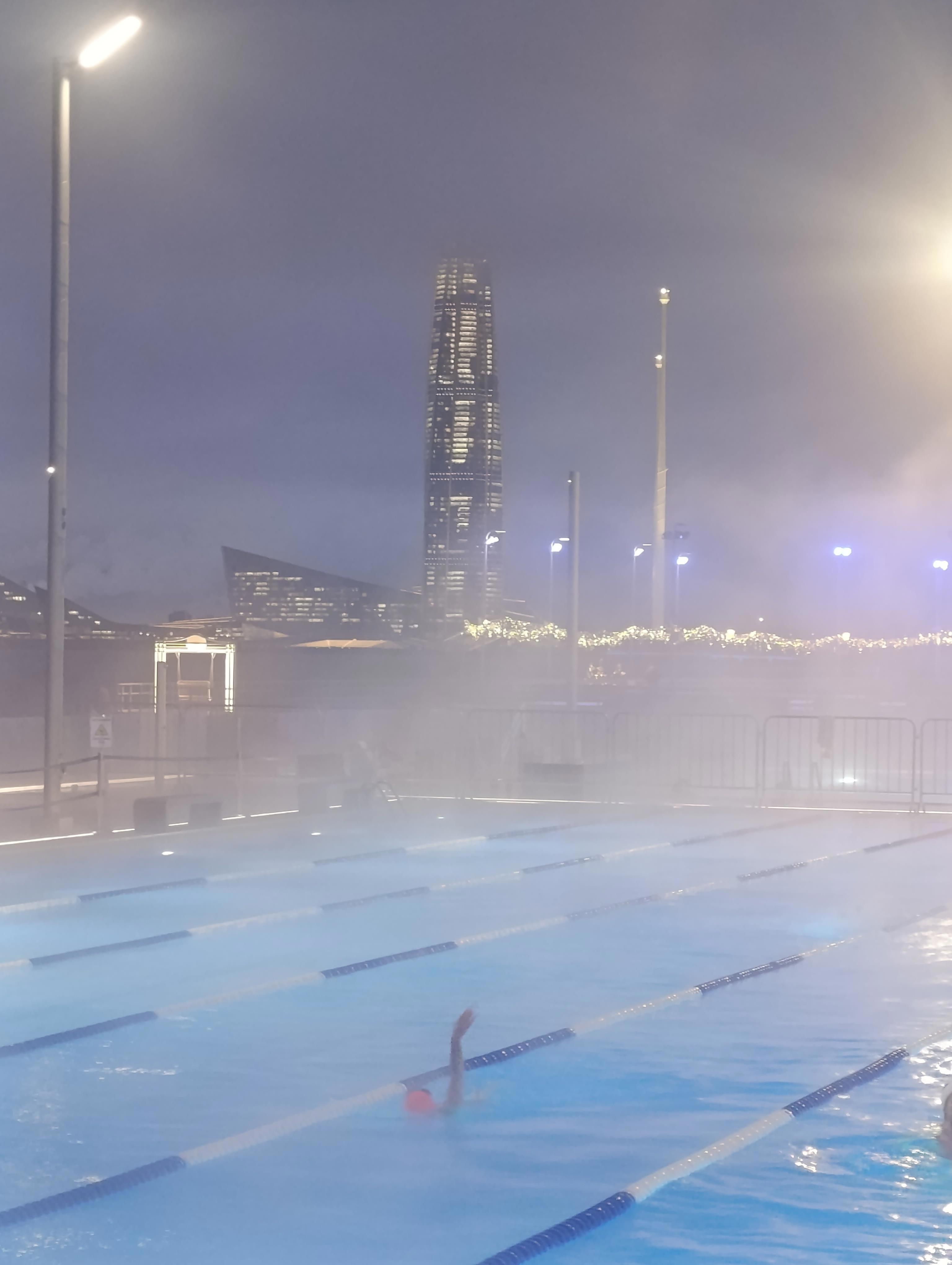 Сеанс с трёх до шести идеален тем, что ты цепляешь и дневные виды, и вечерние. Вокруг красиво, и контраст с фигуристами, пролетающими мимо, занятен и приятен. Нам, безусловно, понравилось, но я бы посоветовала брать с собой, помимо купальника, пару полотенец, шапочку, в идеале тканевую, и стакан под воду. Кулер есть, но пластиковые стаканчики быстро закончились. В коридорах есть удобные лежачие шезлонги. В сауну помещается порядка тридцати человек. А на сеанс максимум запустят двести. Рада, что с нами пришло человек пятьдесят, не больше. Чуть не забыла, парковка есть и бесплатная. Ближайшее метро «Зенит».