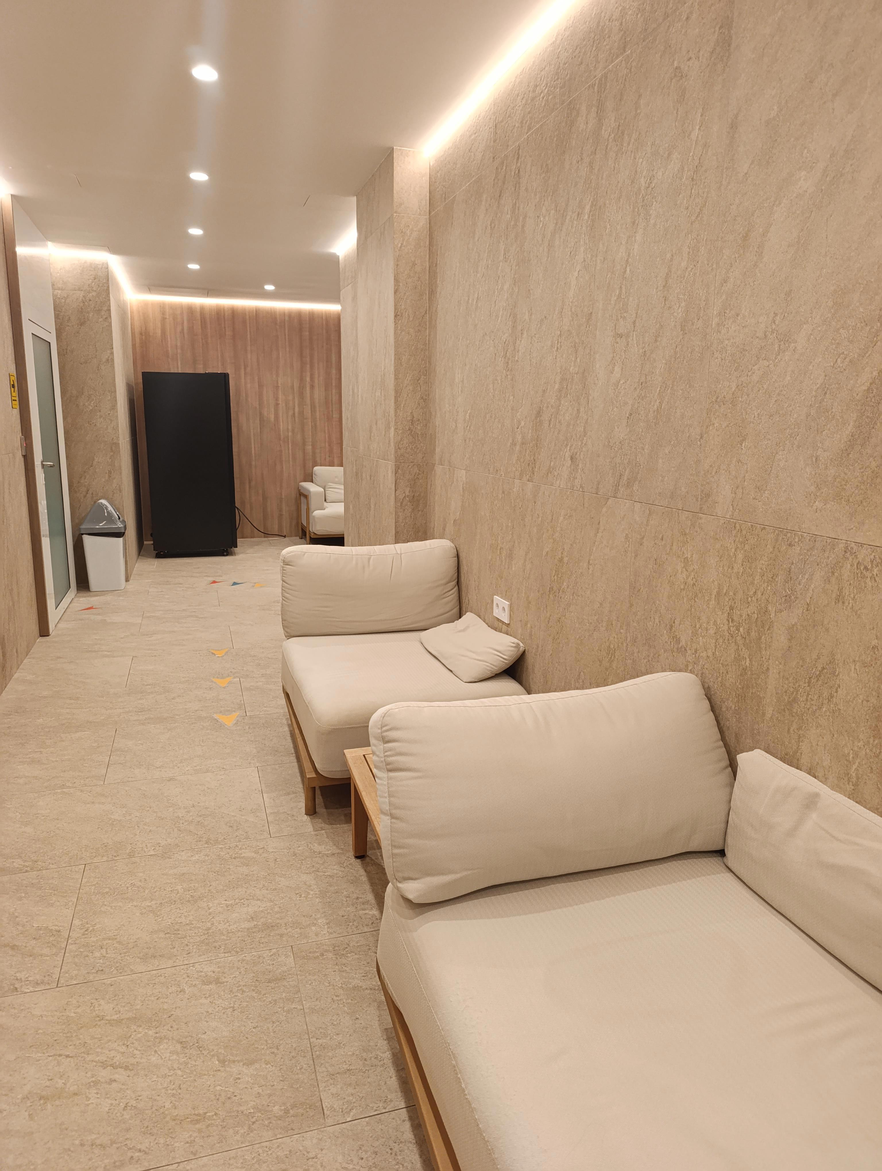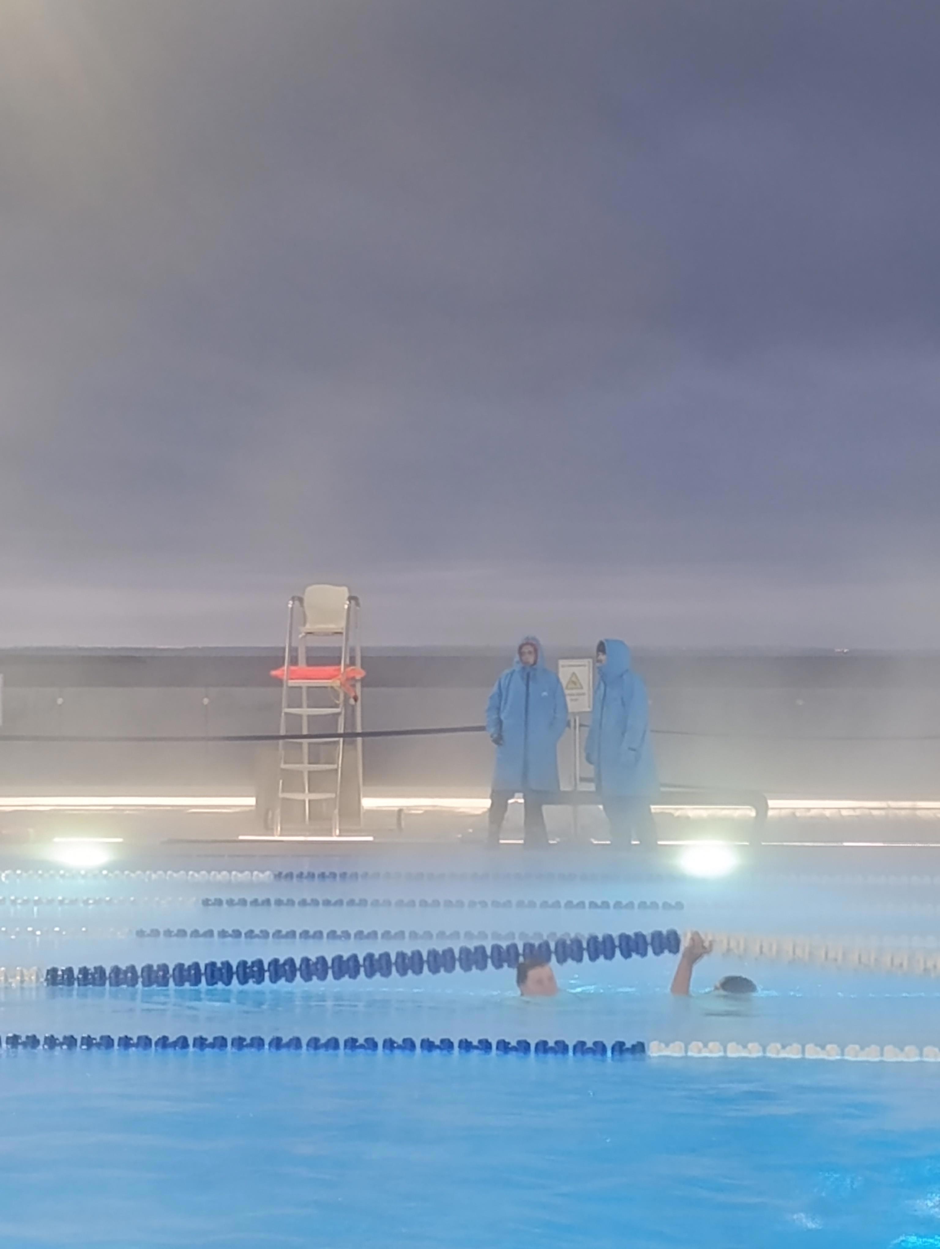 В бассейне есть: гардероб, прокат купальников, халатов, полотенец. Мы же пришли со своими аксессуарами. Сауна входит в цену сеанса. На улице было +2, вода в бассейне +31. В коридорах между сауной и раздевалкой +21. То есть холод ощущаешь на тех пятидесяти метрах от тёплого коридора до спуска в воду. Первый раз пошли бодро, но терпимо. Второй раз уже в торопях. Третий и четвёртый раз откровенно подмерзая. Купальных зон две с половиной. Одна чаша длинной в 50 метров разделена на четыре дорожки. Одна широкая общая и три для скоростного плаванья. В отдельной мелкой чаше есть имитация джакузи, которую необходимо включать кнопкой на стене. Мы сходили в неё разок, всё остальное время плавали.