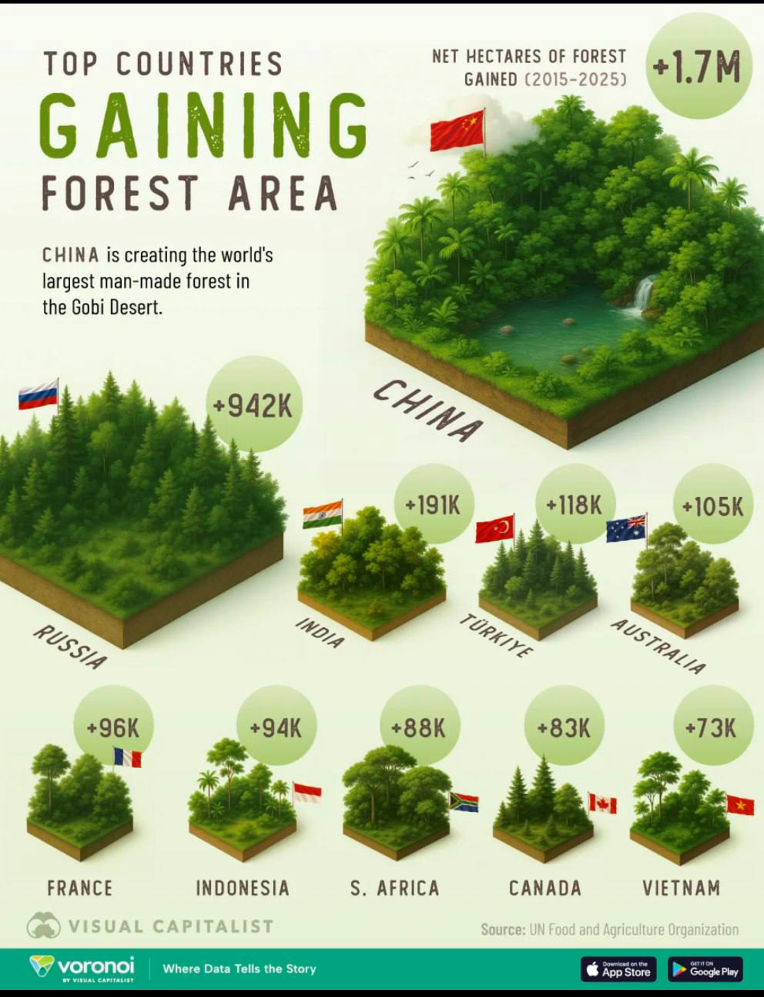 Первая десятка государств, в которых за последние 10 лет был наибольший прирост площадей лесов (в тысячах квадратных километров). Понятно, речь идёт не о том, что леса расширяются сами по себе, а о деле рук человека: о лесовосстановлении, о посадках деревьев . То есть, вот как раз о том, что считается признаком цивилизованности страны, её заботы о будущем etc.