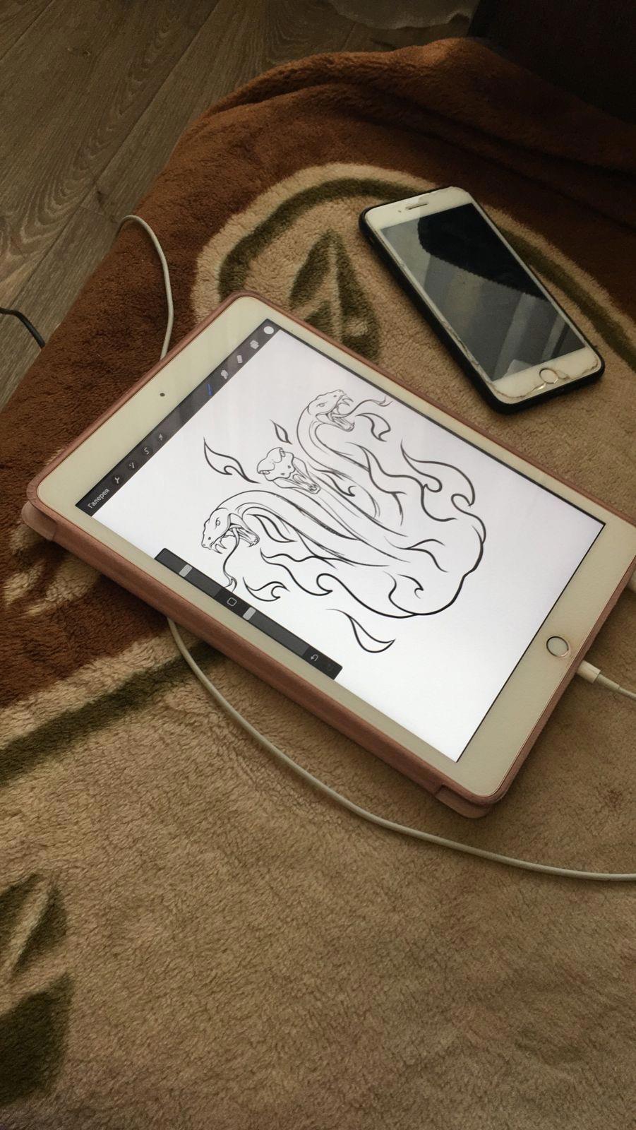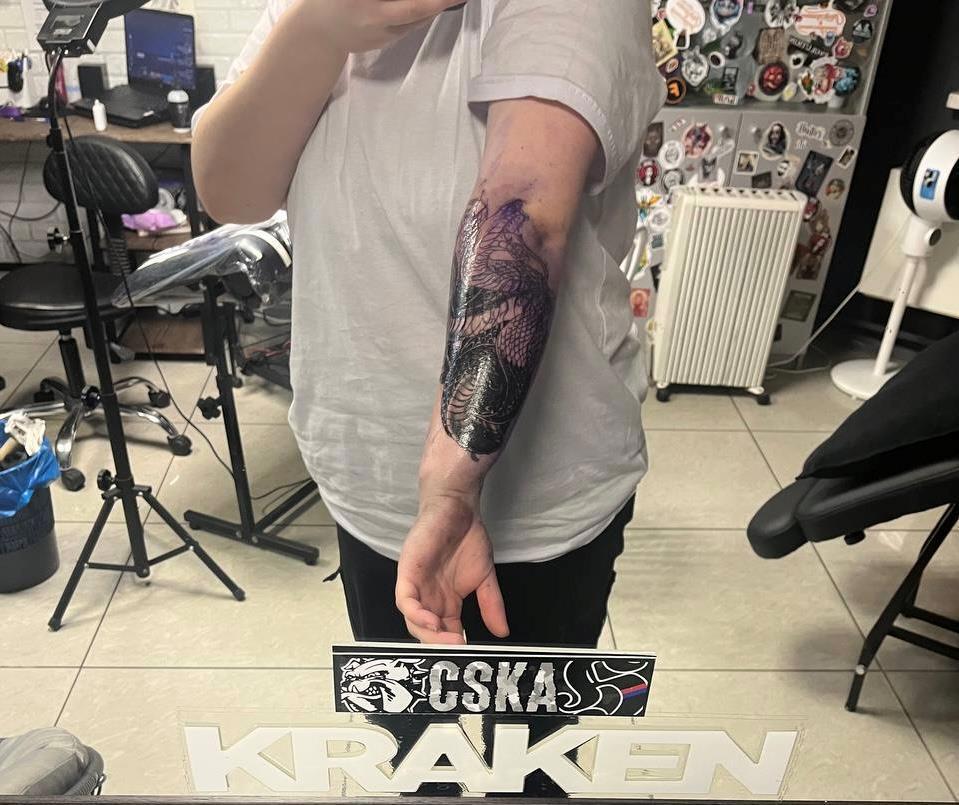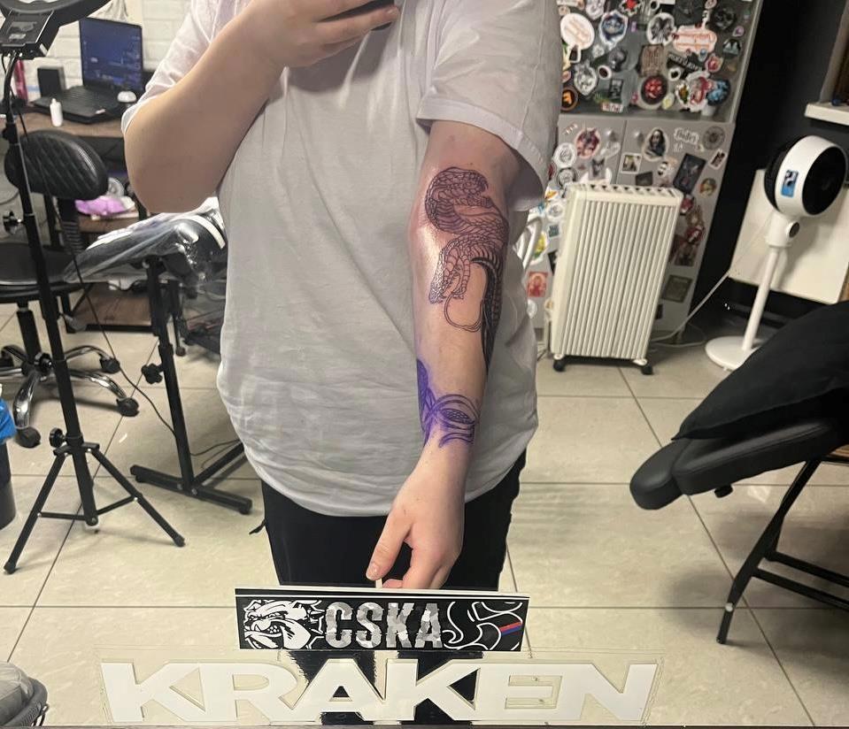 Задумка тату заключалась в трехглавом змее. Да-да, вы не ошиблись. Одно туловище и три змеиные головы. Я сказала об этом Алисе. Она набросала черновик, и я влюбилась в него. Никогда не заберу своих слов, но мне действительно это понравилось. Наверное, это связано с тем, что я люблю вообще все, что делает Алиса. Сейчас, если сравнивать её с нынешней моей татуировкой — конечно, это небо и земля. Но! Повторюсь, я все равно любила первую тату. Алисе же она не нравилась от слова совсем. И в какой-то момент, не знаю почему, но я решила переделать её. Перебить. Закрыть другой. Я сходила на консультацию, узнала, сколько будет стоить перекрытие, обалдела от цены. Но потом все равно решила сделать это. С деньгами мне помогли — подруга Алина и начальник. Сама я откладывала. И в итоге теперь у меня змеи, обнимающие руку. Посыл остался тот же. Когда прочитаете ту самую книгу — поймете. А когда мне не хочется долго рассказывать о тату, я говорю, что родилась в год змеи, вот и набила нечто подобное (это правда - 2001 г.).