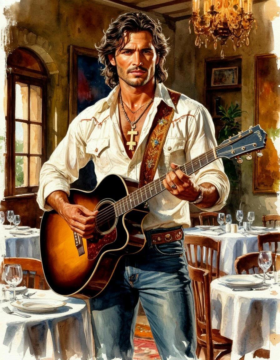 Один из охранников Галины Леонидовны исчез, чтобы минуты через две появиться вновь с семистрункой из светлого дерева, скорее всего звучащую, как дрова. Я надел ремень, провёл по струнам. Расстроена. Присел на стул, чтобы подтянуть колки, камертона у меня с собой, конечно, не было, но пришлось просто подстроить все струны под басовую. Сам же Буряца вытащил гитару совсем другую, из тёмного полированного дерева. Видно, таскал её со собой.