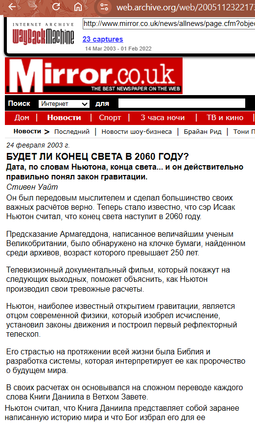P. S. Самое поразительное! Вчера, забив в поисковик свою книгу .. сеть выдала статью из 2003 года Daily Mirror о записях Ньютона .. о Армагеддоне! По этим записям (Исаака Ньютона) в Британии сняли документальный фильм. Исаак Ньютон - изучая книгу пророка Даниила - смог рассчитать тот год Конца Света!