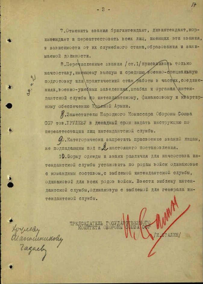 Третье - это «вилка» в присвоении званий. Этого нет в Постановлении СНК СССР, но такой пункт включен, например, в Инструкцию по переаттестованию начальствующего состава интендантской службы. Что он обозначает? Ровным счетом то, что каждый аттестуемый мог получить звание рангом выше или ниже. То есть, по результатам аттестации, решением аттестационной комиссии интенданту 1-го ранга могли присвоить как звание полковника интендантской службы, так и подполковника. Впрочем, этот порядок касался всего среднего и старшего начсостава.