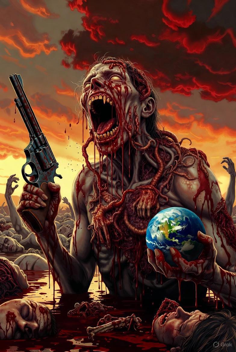 Небо сначала стало красным — не от заката, а от того, что атмосфера начала гореть. Потом оно стало чёрным, потому что пепел миллиардов сожжённых тел закрыл солнце навсегда. Спутники падают, как мёртвые птицы, оставляя за собой огненные шлейфы. Океаны кипят и испаряются, обнажая дно, усеянное костями китов и человеческими скелетами, которые тянутся к небу в последнем немом крике.