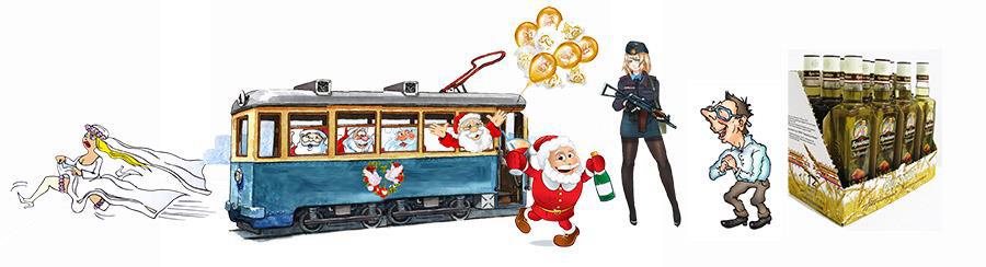 Когда подъехал трамвай, уже вкусившие дармового зеленого вина Санта Клаусы, разместились в вагоне и, решив начать готовить трамвайную невесту к таинству, за ранее, разыгравшиеся Морозки стали скандировать слоганы на матримониальную тему, типа: