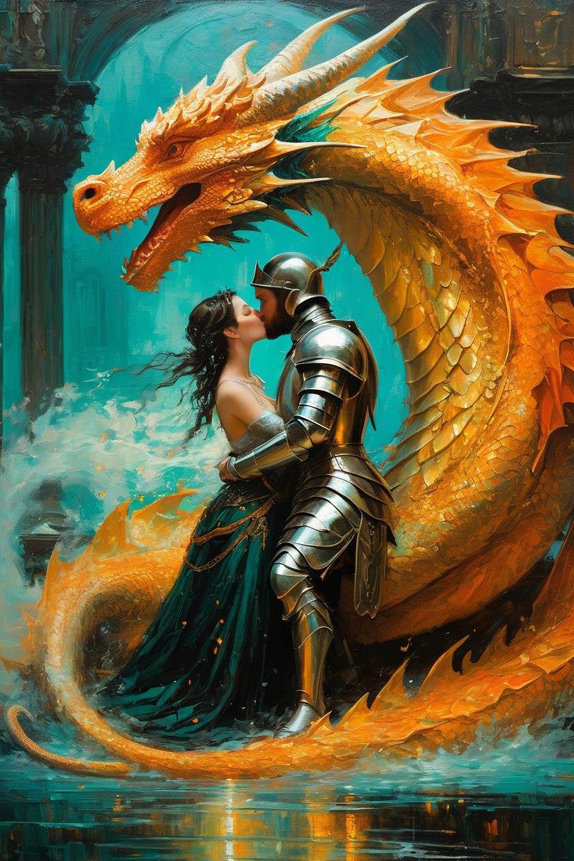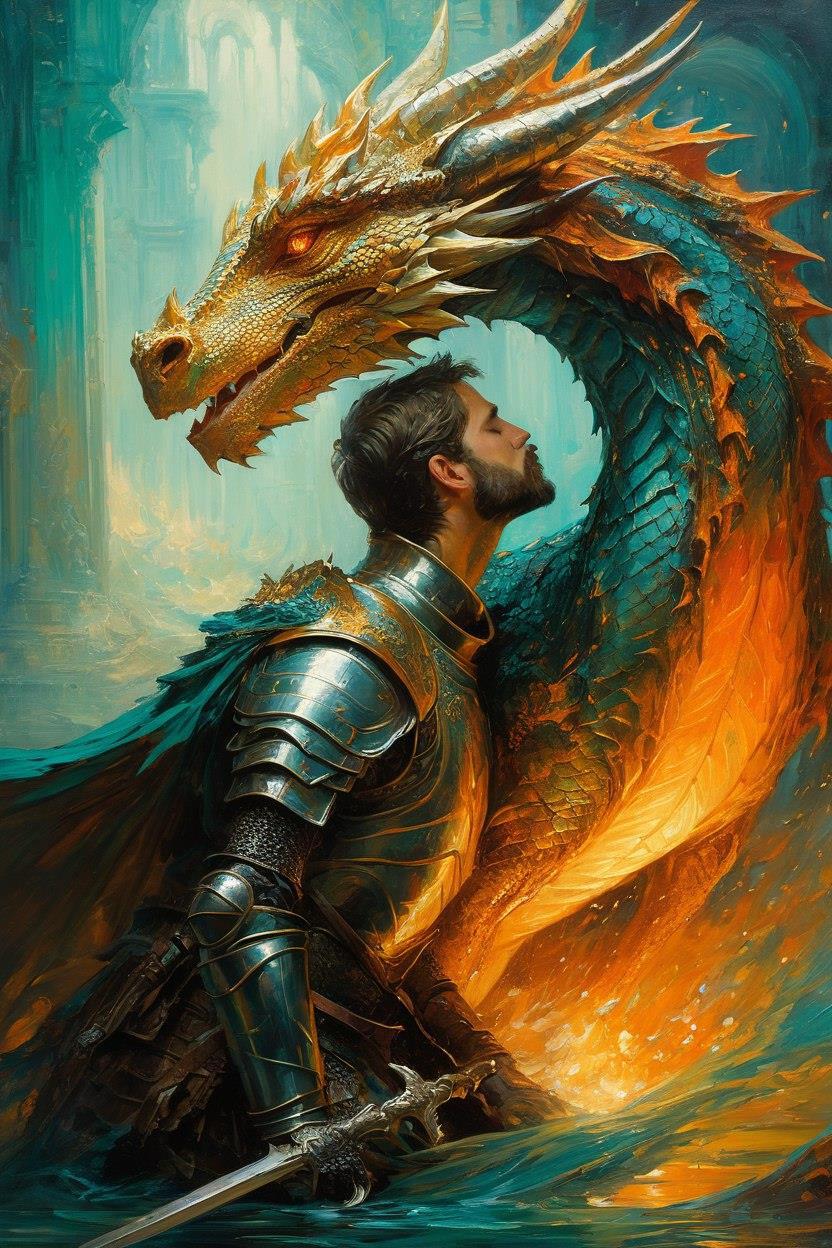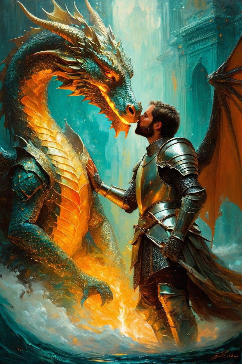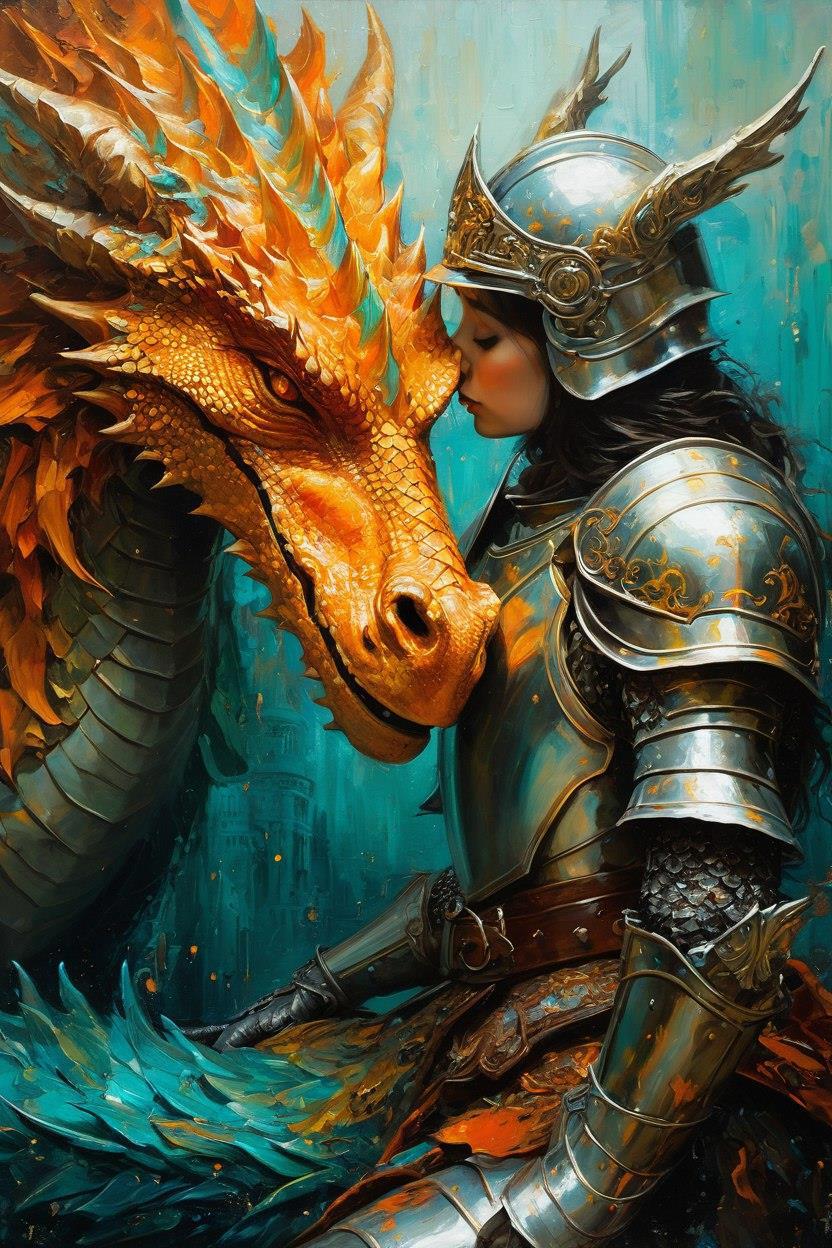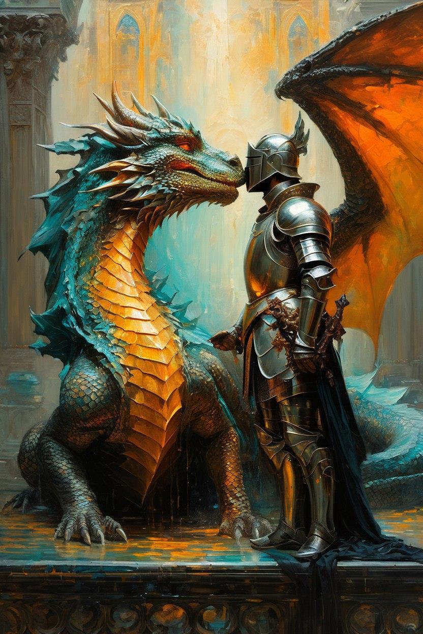 Развлекаюсь с нейронкой-артером. И тут мне в голову приходит отличная идея. Где фэнтези, в котором рыцарь влюбляется в женщину-дракона? Шрэка не предлагать.