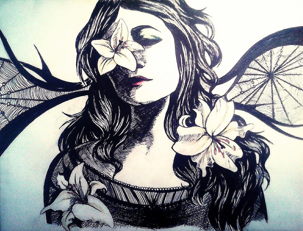 Вдохновилась тогда фото подруги, на котором была видна лишь половина лица и волосы. Атмосфера фото сыграла должным образом и остальная картинка сложилась в уме сама по себе.