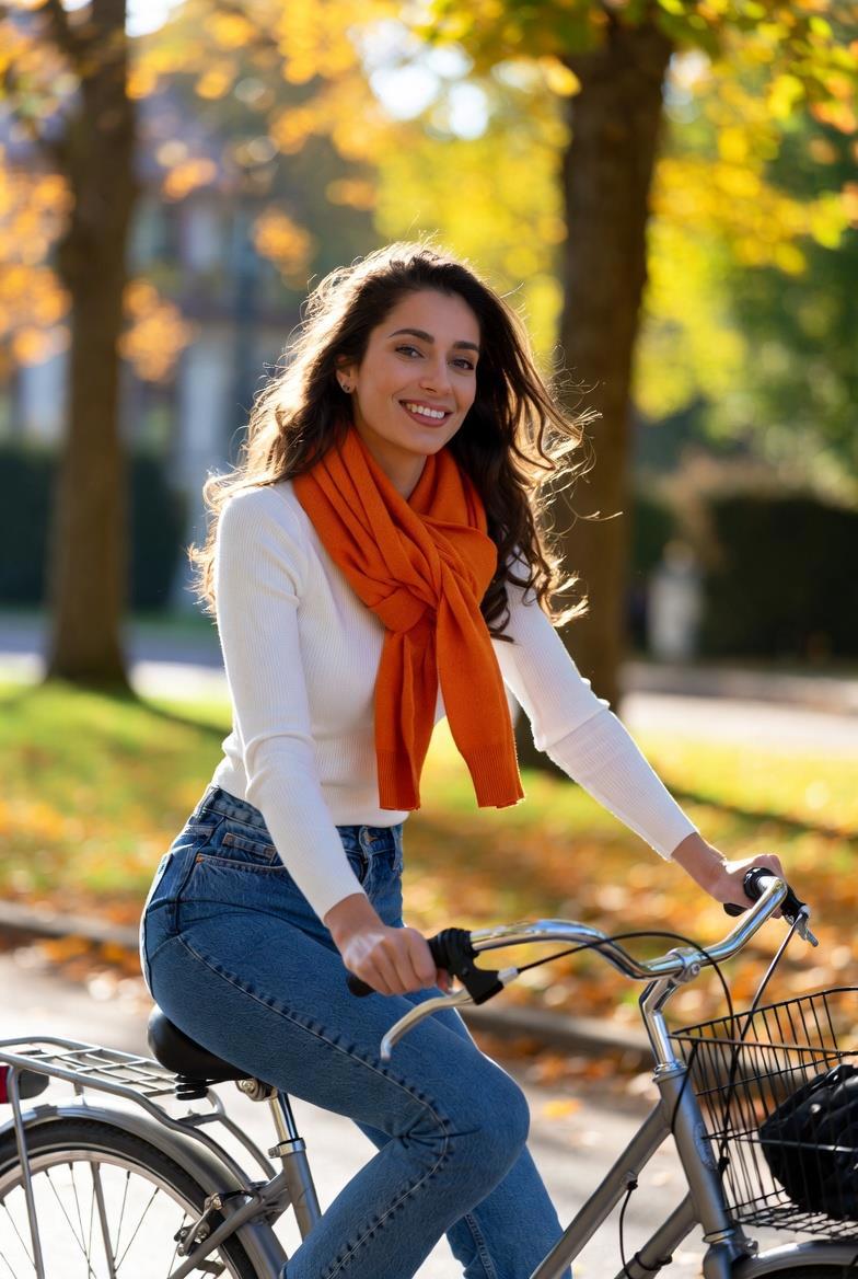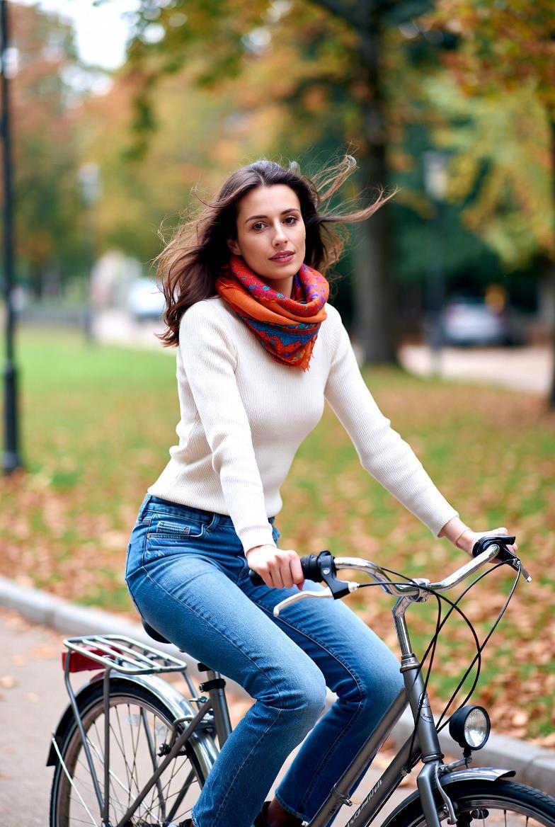 Пример: промт: девушка француженка на велосипеде в осеннем парке ,одета в джинсы и белый свитер,на шее пестрый шарф.Результат: